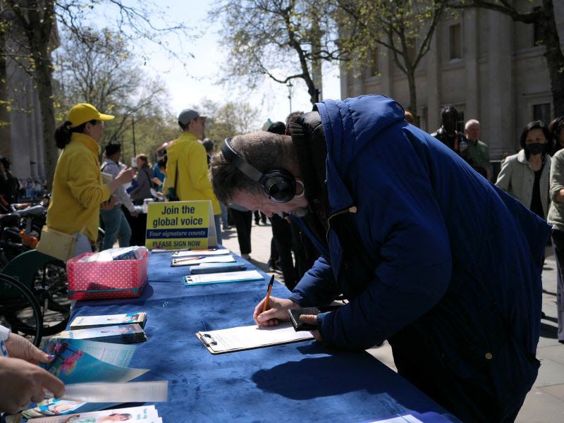 一位印巴族裔的男子在阅读了一会法轮功学员受迫害的展板后,流下热泪,难过地问学员说:“这是真的吗?”学员说:“都是真的。”他来到桌前签名,一边签名一边流泪。