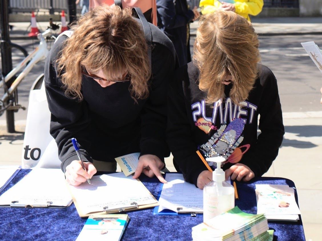 几位少年在看过法轮功学员的功法展示和展板后,呼啦啦地围拢到桌前一一在征签表上郑重地签下自己的名字。一位少年签完后郑重地说:“这件事对我很重要!”