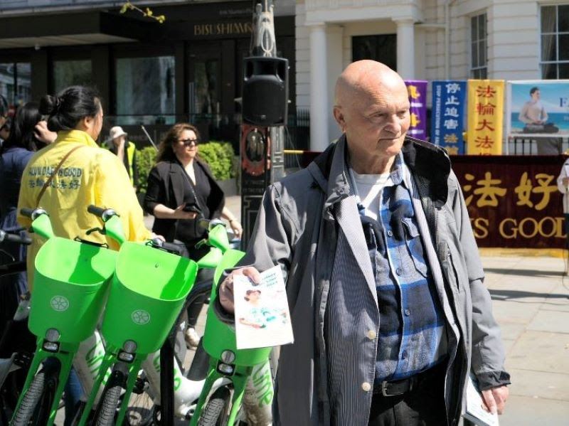 英国法轮功学员托尼(Tony Archer)已经七十六岁,但精神矍铄,他会说多国语言,还在学习着中文。他表示自己的人生有过许多起起伏伏,当过老师,也曾经误入吸毒的歧途。他在二零零一年的一个周日在报纸上看到一篇关于“四·二五”的报道,从而开始修炼法轮大法。