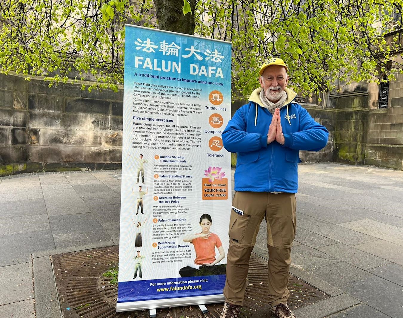 来自苏格兰北部阿伯丁的法轮功学员埃迪·艾特肯(Eddie Aitken),退休前是水文测量师,二零零四年七月,他正在学习一种韩国武术。武术教练的妻子向他推荐一种气功,引起了埃迪的好奇。在埃迪搜索各类气功时,他发现了法轮大法的网站,他感觉这是个能带来光明与希望的功法,同时他也看了一些中共的负面宣传。但他想,无论如何,都要试一试,然后自己做判断。