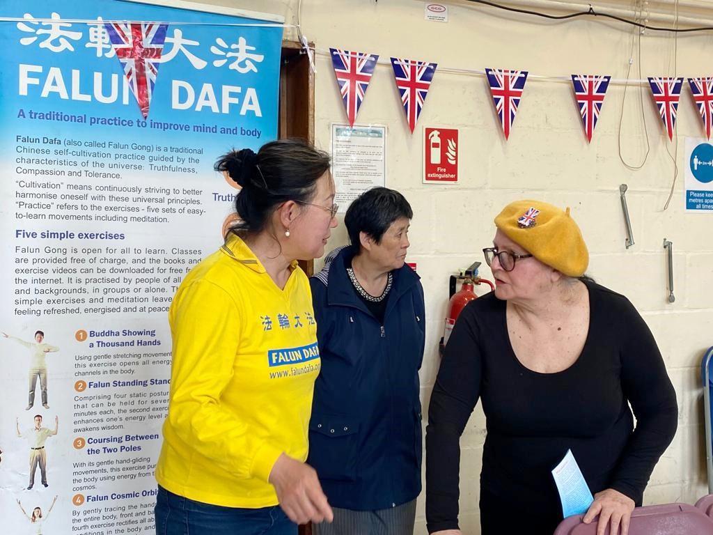 一名英国女士凯洛琳(Caroline)说:“我今天起床后就感觉浑身疼,心情很不好,郁闷,都不想出来了。但到这里跟着你们炼功,我的确感觉好多了,腰部,腿关节的类风湿关节炎痛也有很大缓解。你们的功法太好了,我要接着学炼。” 学员跟她分享自己妈妈的修炼故事,鼓励她坚持炼功,调整心态,一切会有好转。她说,我希望得到好的能量,我会去找法轮功书看看。