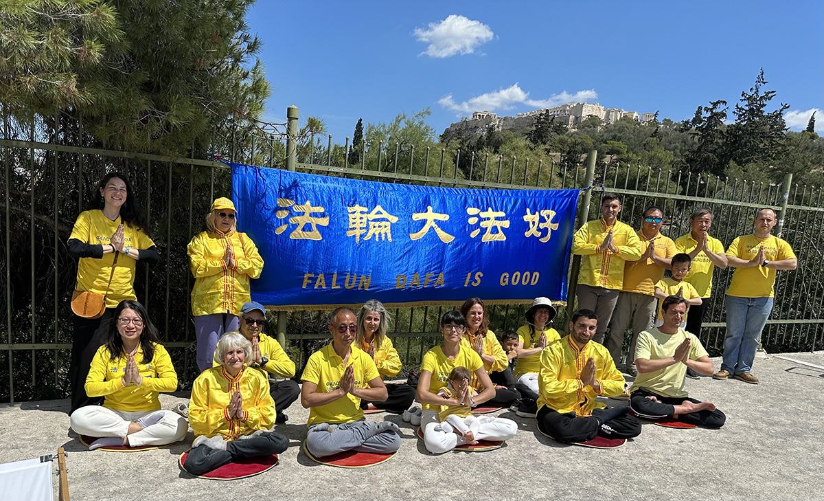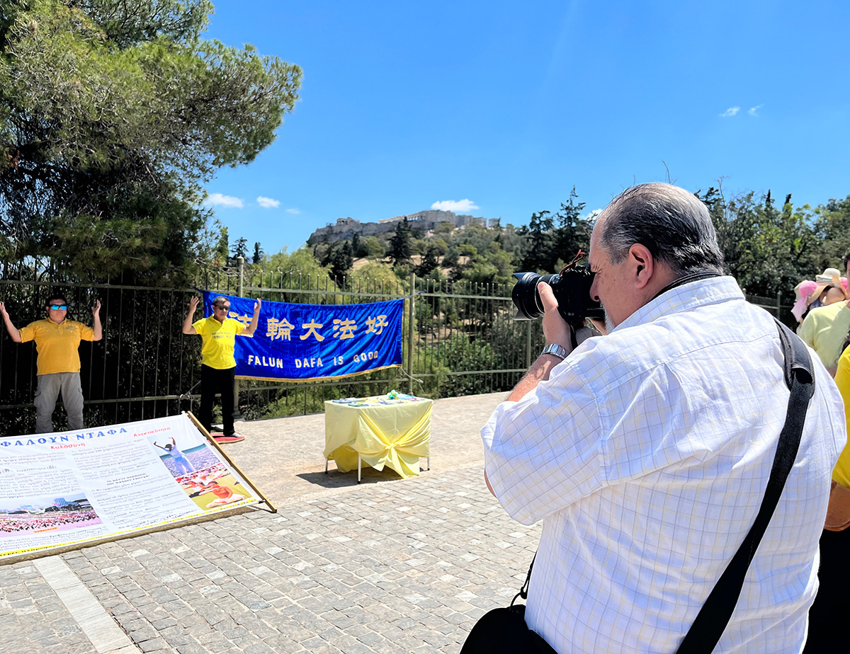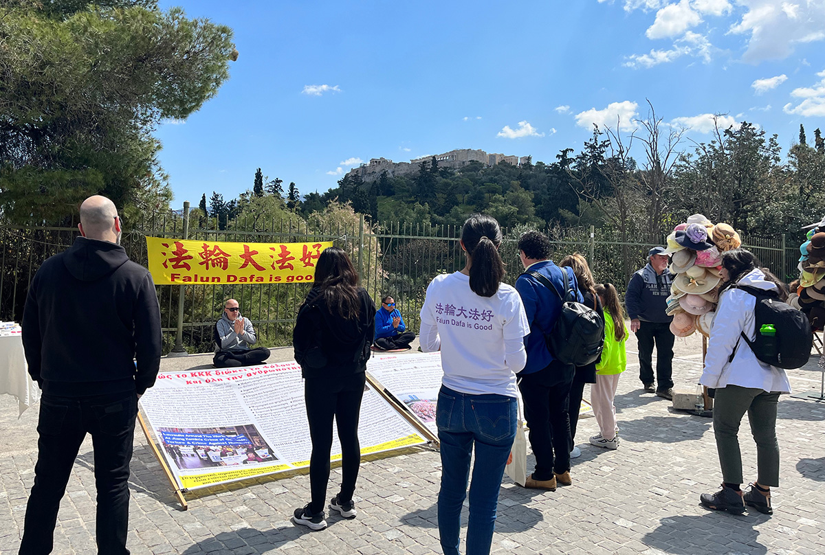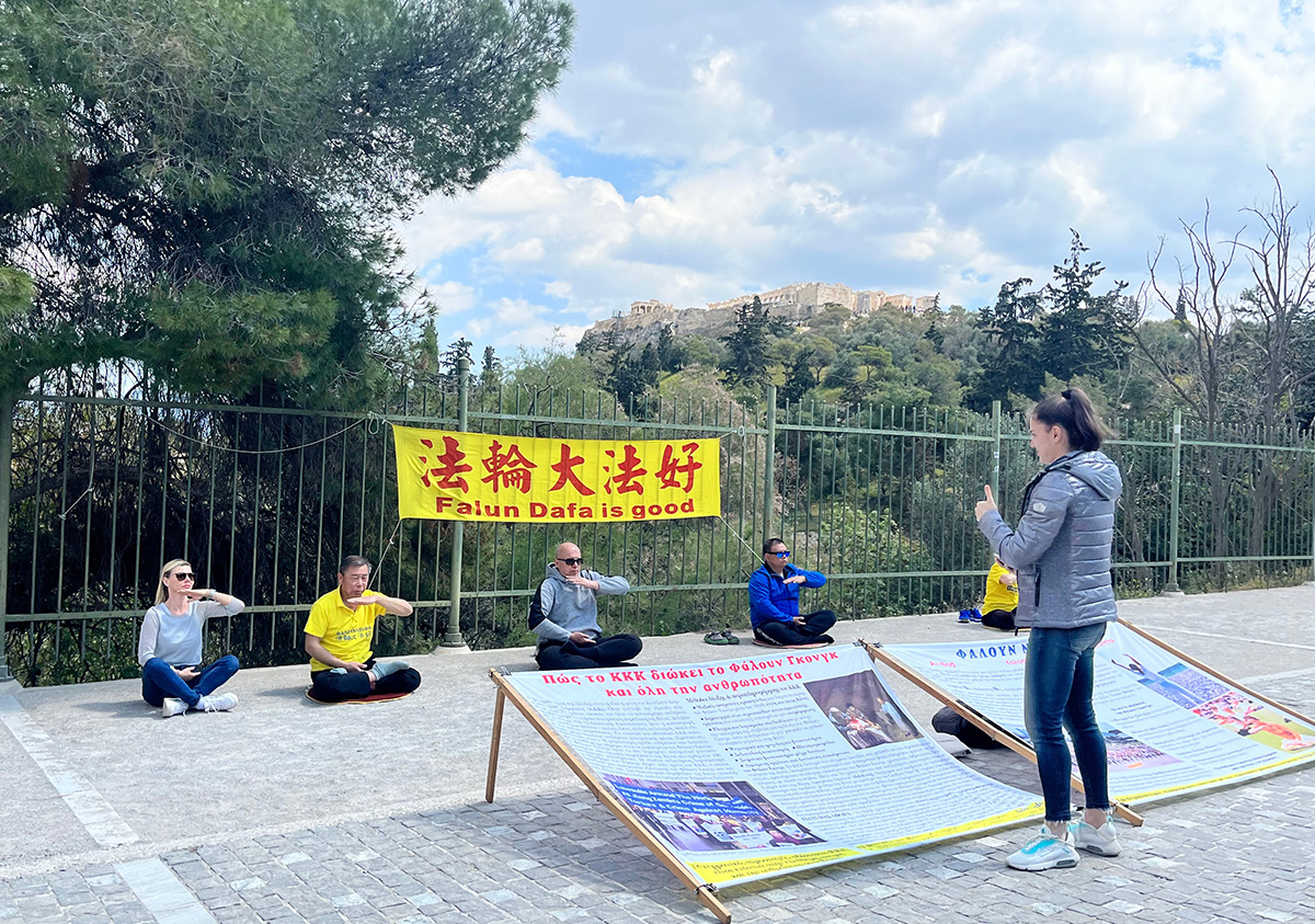 法轮功学员身后不远的小山上,就是著名的雅典卫城(Acropolis of Athens),风景优美,不断有游客和市民经过,因此学员多次活动都选在此地举办。
