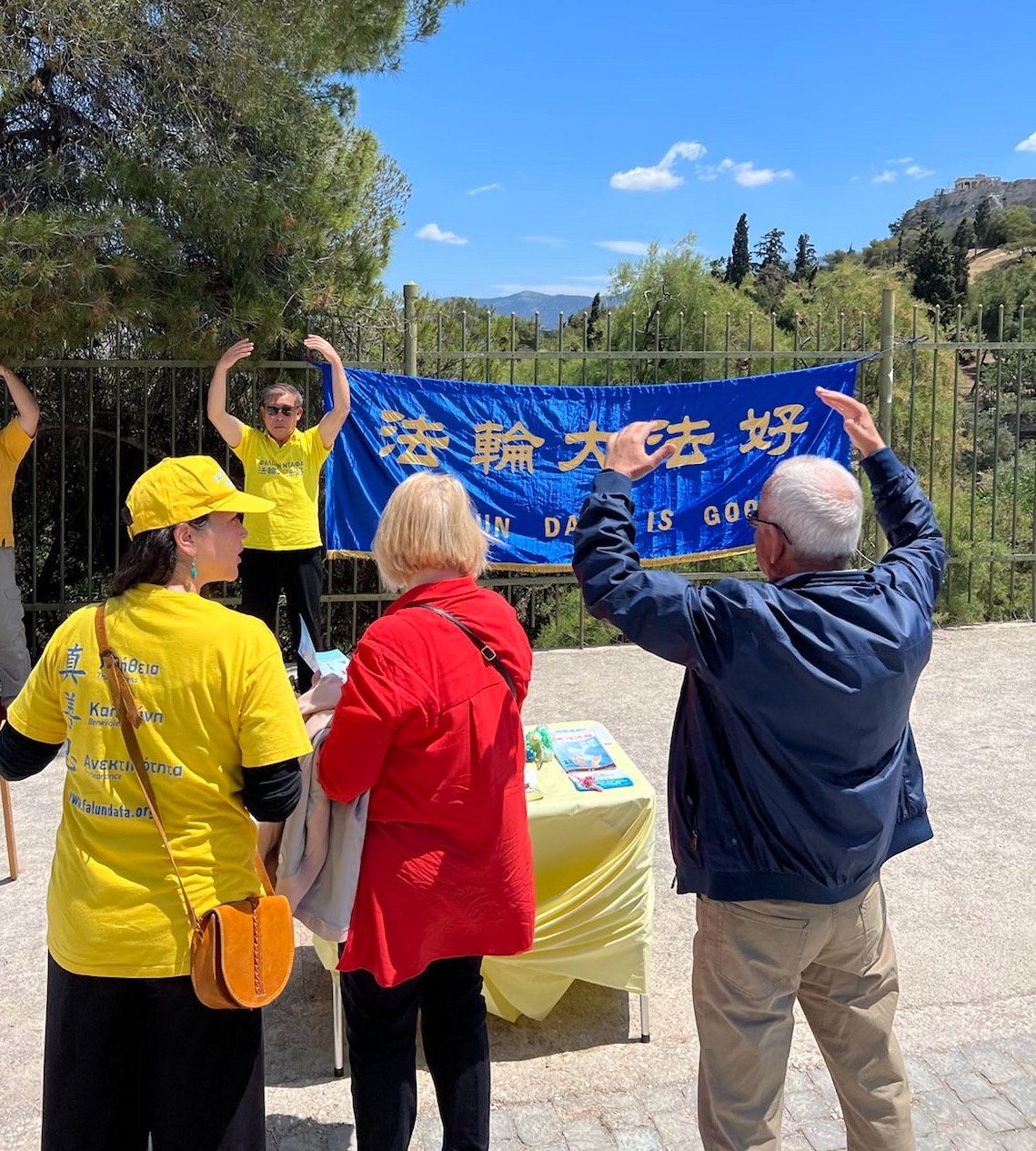 五月七日,法轮功学员再次来到希希奥(Thissio)的商业街,展示功法,分发传单和带有“真善忍好 法轮大法好”标签的小莲花。