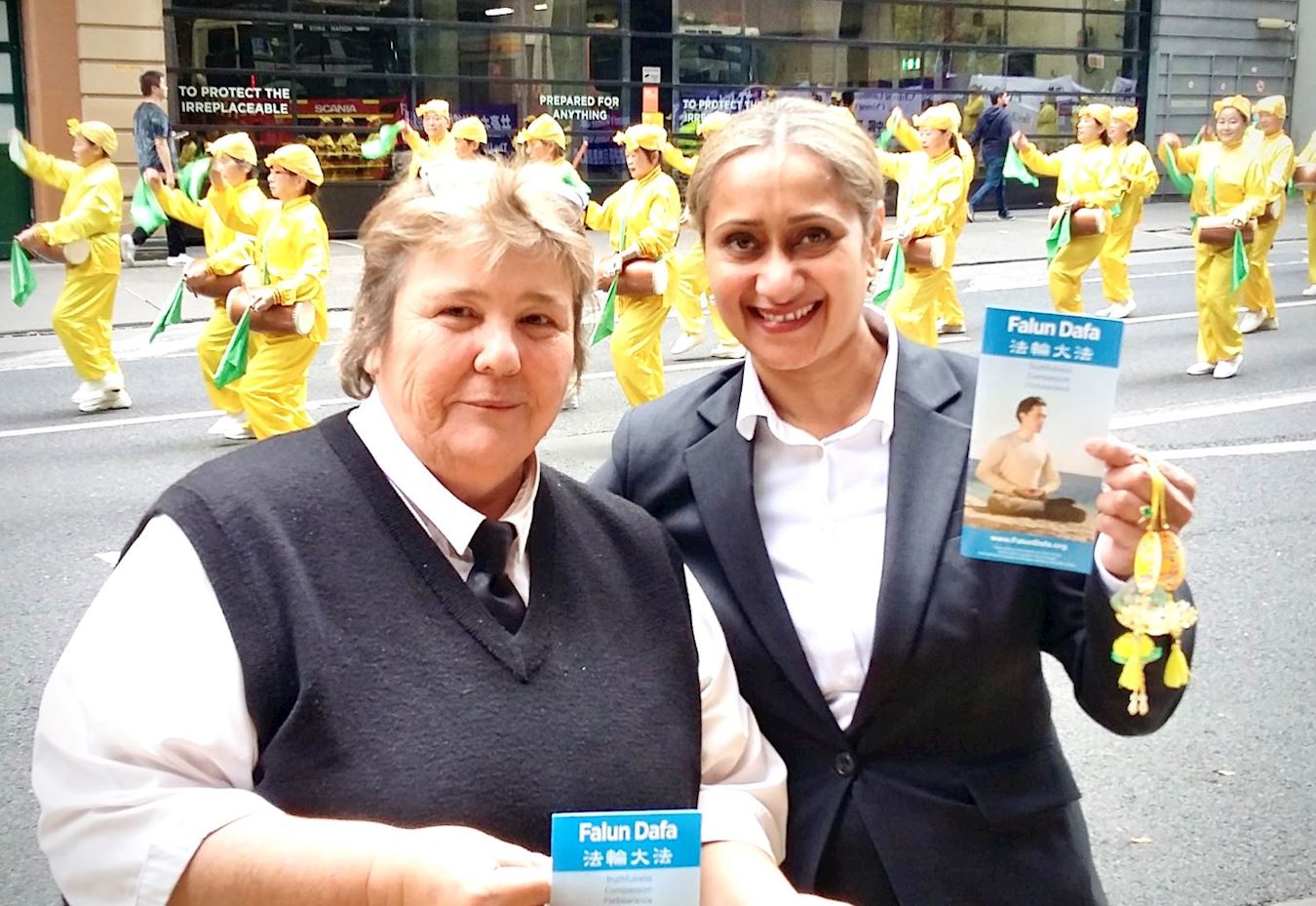 罗宾(Robyn Turnbull)说:“我在此看游行已经五年了。看游行使我感受到祥和与爱!我经常看到法轮功学员在小区的炼功活动。我认为(中共)活摘(法轮功学员)器官的罪行永远都不应该发生,这是非常邪恶的。为了换取器官杀害活人。我不能容忍!这是绝对不人道的罪行。失去亲人的家属是无助和痛心疾首的。希望中共停止活摘和贩卖器官,迫害应该被尽快被制止!我们人类应该返回善良,互相关爱,拥有祥和的人际关系。”