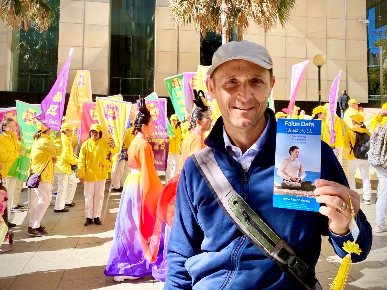 罗伯特(Roberto Tranarin)在科加拉(Kogarah)曾经与法轮功学员一起炼过几次法轮功,感受相当好,很轻松。他谴责迫害:“人们应该自由地表达他们喜欢的东西。”