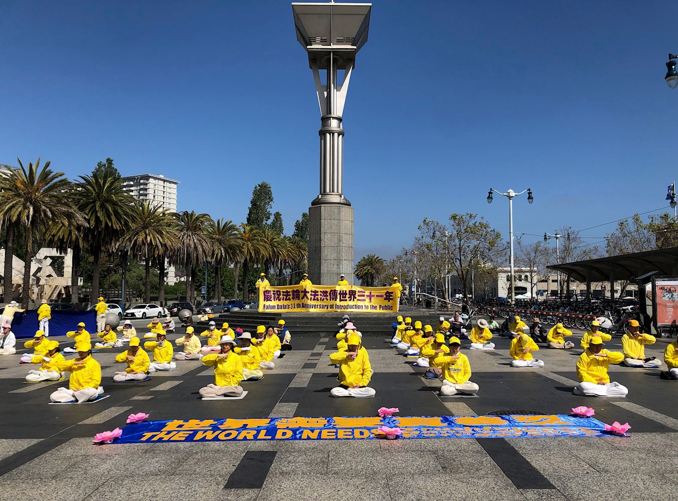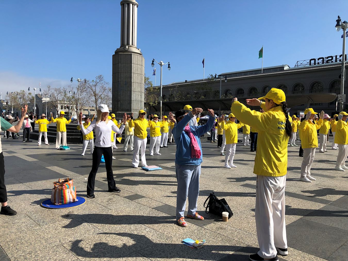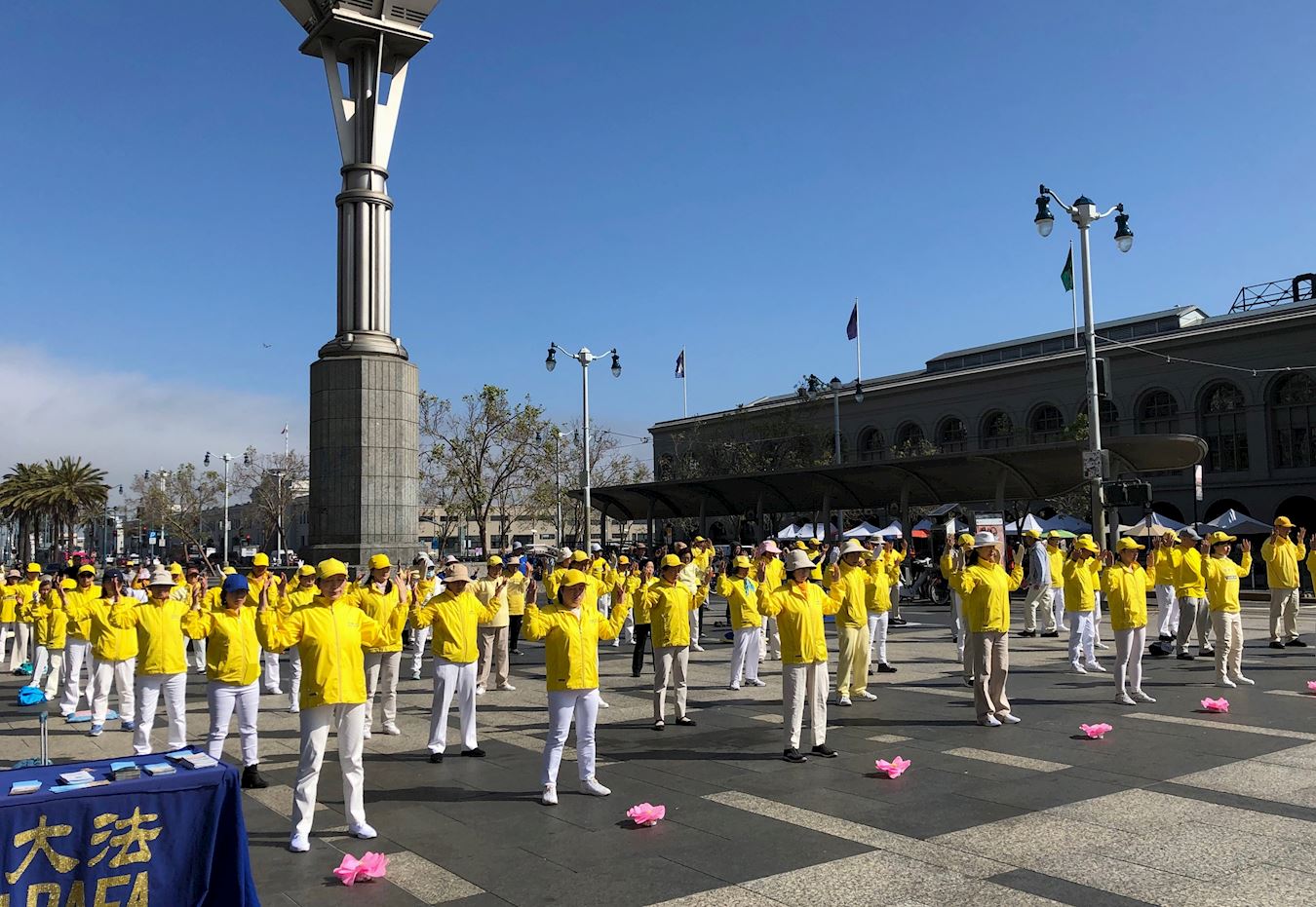 '图1~3:二零二三年五月十三日,庆祝世界法轮大法日,法轮功学员在旧金山渡轮大厦前的广场集体炼功、讲真相,传播法轮功的美好。'
