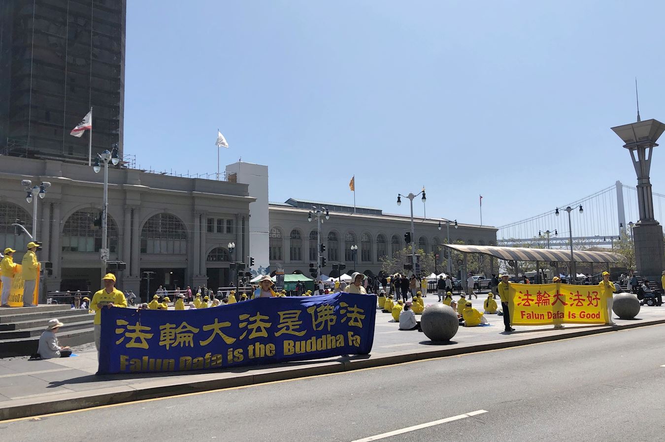 当天的旧金山湾区,风和日丽,渡轮大厦前的广场游人川流不息。许多游客被法轮功学员祥和的炼功场面吸引,驻足观看,纷纷拿出手机拍照,有的与学员交流了解。当得知当日是世界法轮大法日,法轮功是与一九九二年五月十三日由创始人李洪志先生传出,至今有上亿人、在一百多个国家修炼。修炼人以真、善、忍原则为指导,加上炼五套功法,身心受益后,游客们都非常欣喜,不少人表示回去后要多了解,也有的要马上购买大法书《转法轮》,还有的当场学功。