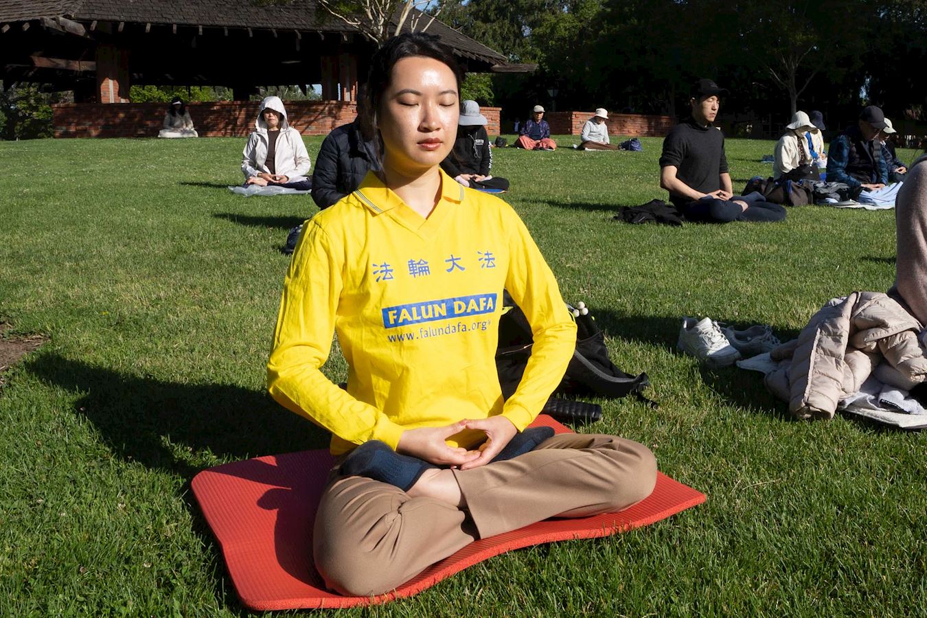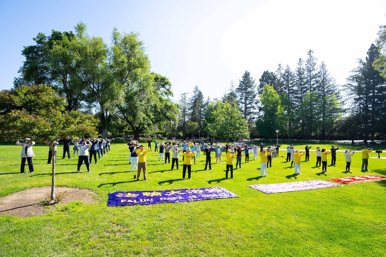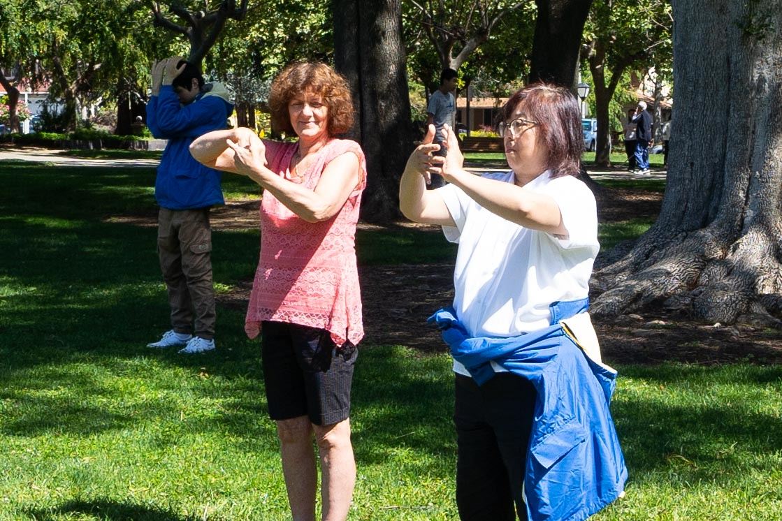图4~5:二零二三年五月十三日,法轮功学员在旧金山南湾桑尼维尔市奥德佳公园(Ortega Park)集体炼功。