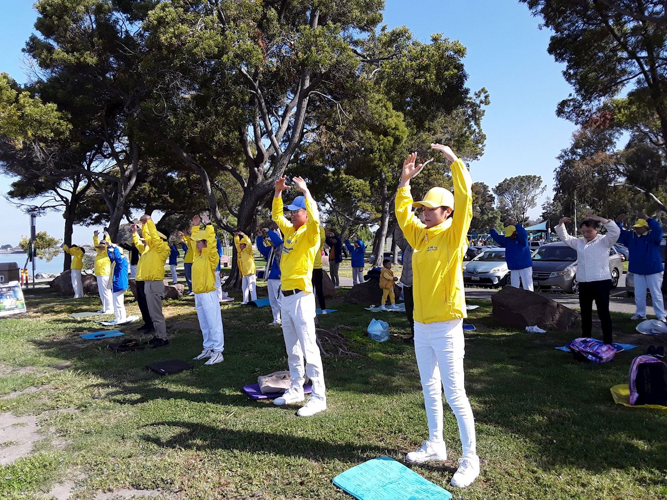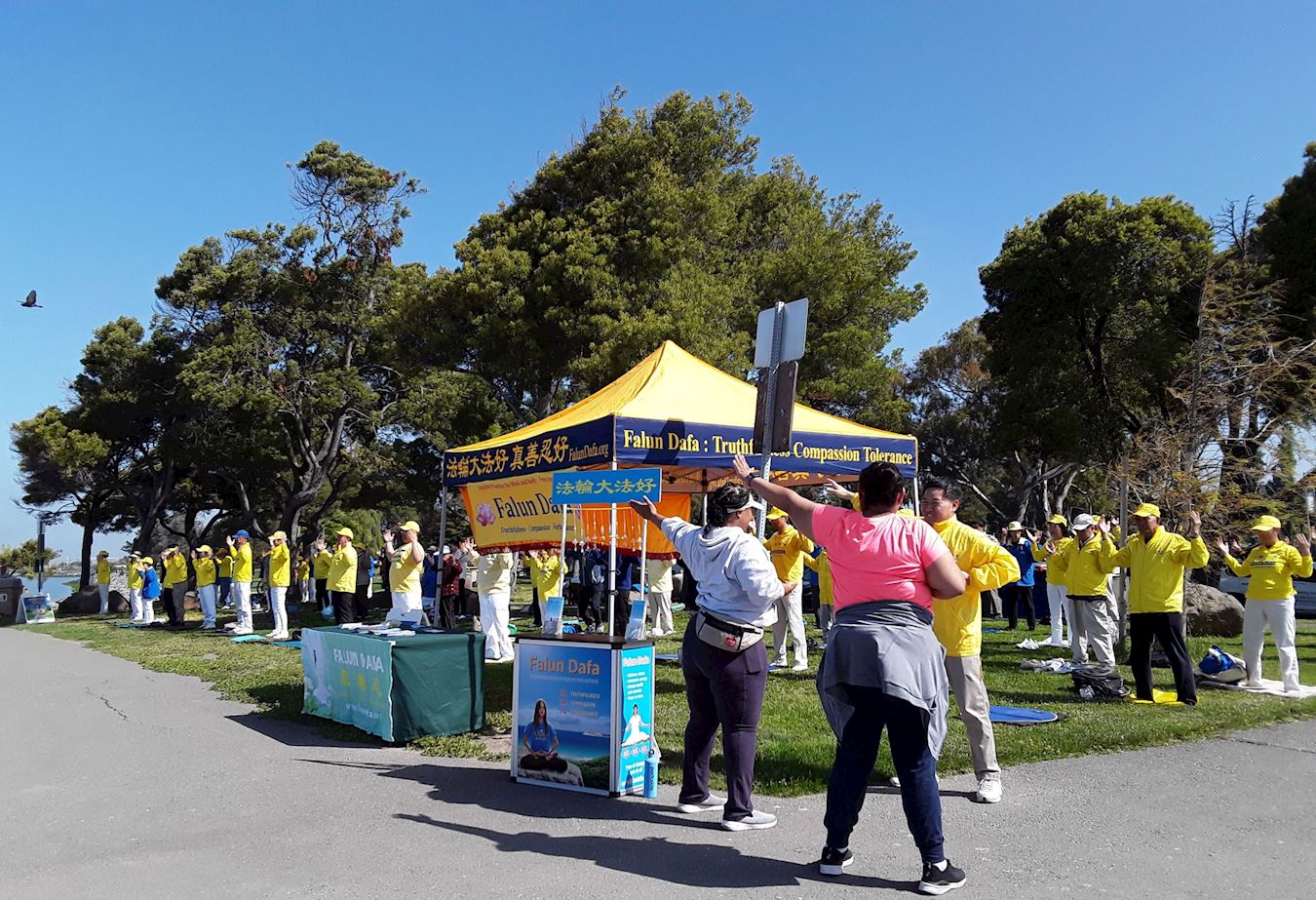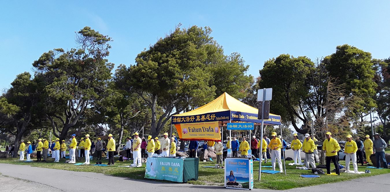 圣利安珠市的海湾阳光明媚,微风熙熙,东湾的法轮功学员齐聚海边公园集体炼功,庆祝“法轮大法日”。许多游人看到法轮功学员的炼功场面,驻足了解。