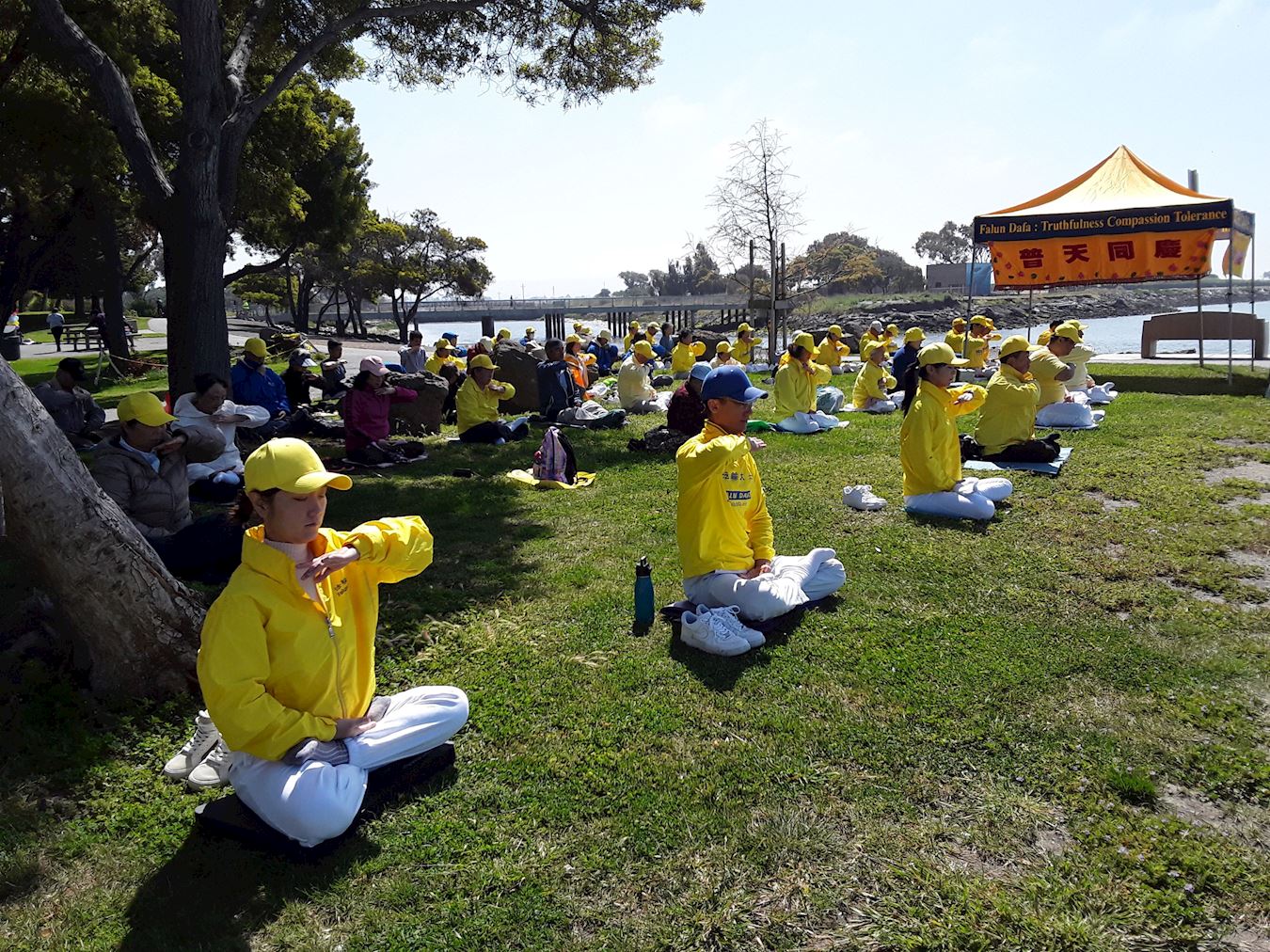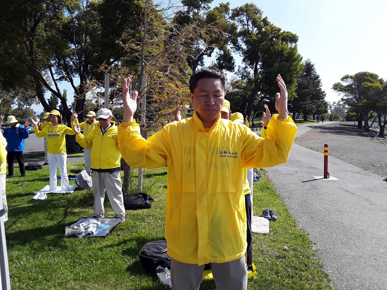 图6~8:二零二三年五月十三日,法轮功学员在东湾圣利安珠市(San Leandro)的玛丽娜海边公园集体炼功,传播法轮功的美好。