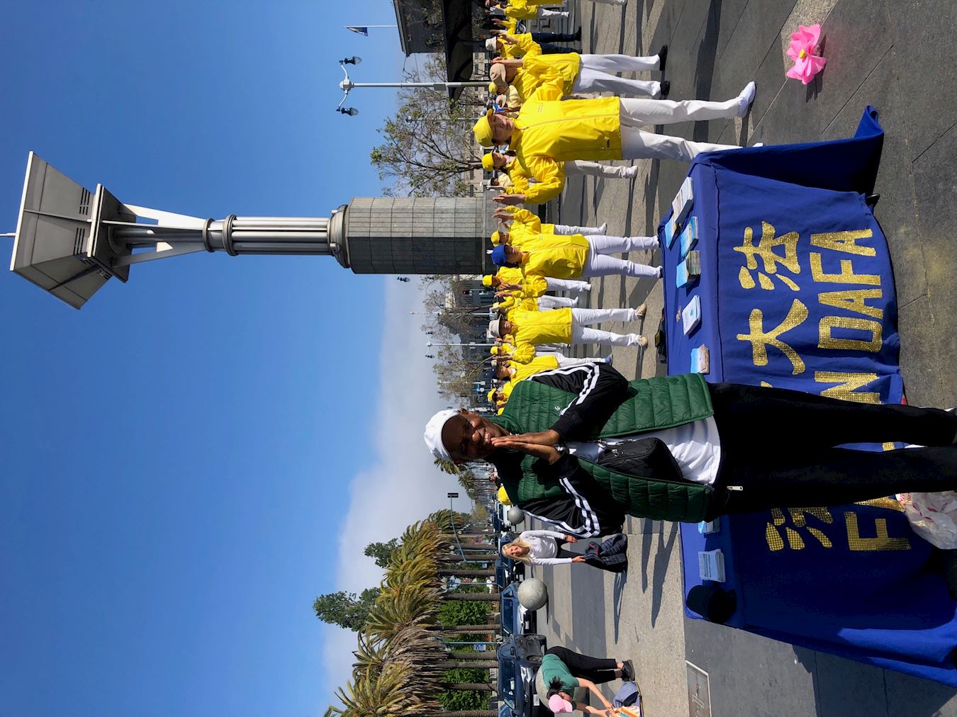 家住旧金山东湾的泽夫·阿门(Zef Amen)当天到旧金山,经过渡轮大厦前的广场,被学员的炼功场面吸引,与学员交谈良久,询问法轮功是什么。当他了解到,法轮大法与其它功法的不同之处在于修心,首先按照真、善、忍做个好人,炼功后才起作用,才会有能量,他非常认可。学员告诉他,法轮功的主要著作《转法轮》已被翻译成四十多中语言,这本书是指导修炼的,在网上可以免费看,他马上想要买书看,并问什么地方可以买到。学员留下了他的电话,表示会把买书的网站发给他,他非常高兴。当得知李洪志师父给学员调整身体,却不收学员一分钱时,他非常感动。学员告诉他:“今天是法轮大法日,也是我们师父的生日。”他双手合十表示祝贺。