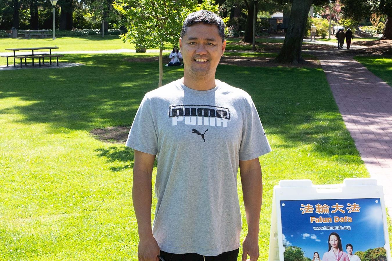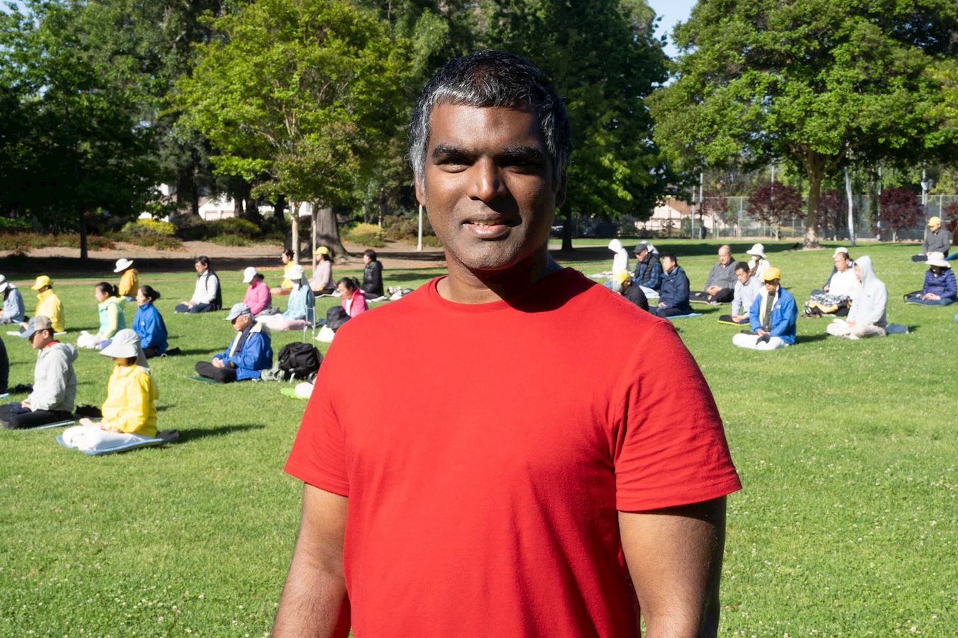 桑尼维尔市奥德佳公园(Ortega Park)位于硅谷,周围高科技公司林立。硅谷电脑工程师拉梅什·尚穆甘(Ramesh Shanmugam)带着太太和孩子在公园散步,看到法轮功学员祥和的炼功场面,就走过来想进一步了解法轮功。“我想学打坐。我看到他们的炼功场面,感到很宁静、祥和,我受到感动,我也想象他们一样。”
