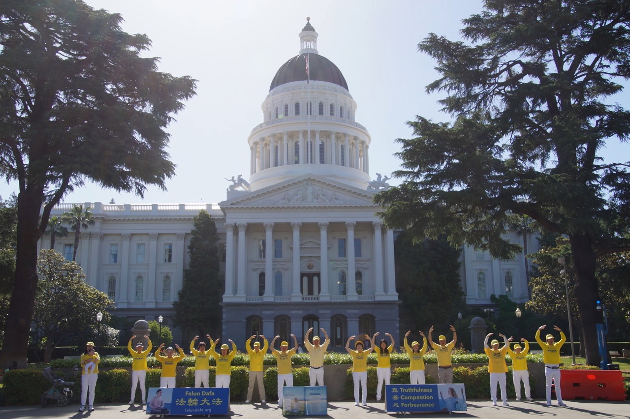 '图22:二零二三年五月十三日,加州首府沙加缅度的大法弟子在州府大楼前,集体炼功,庆祝世界法轮大法日。'