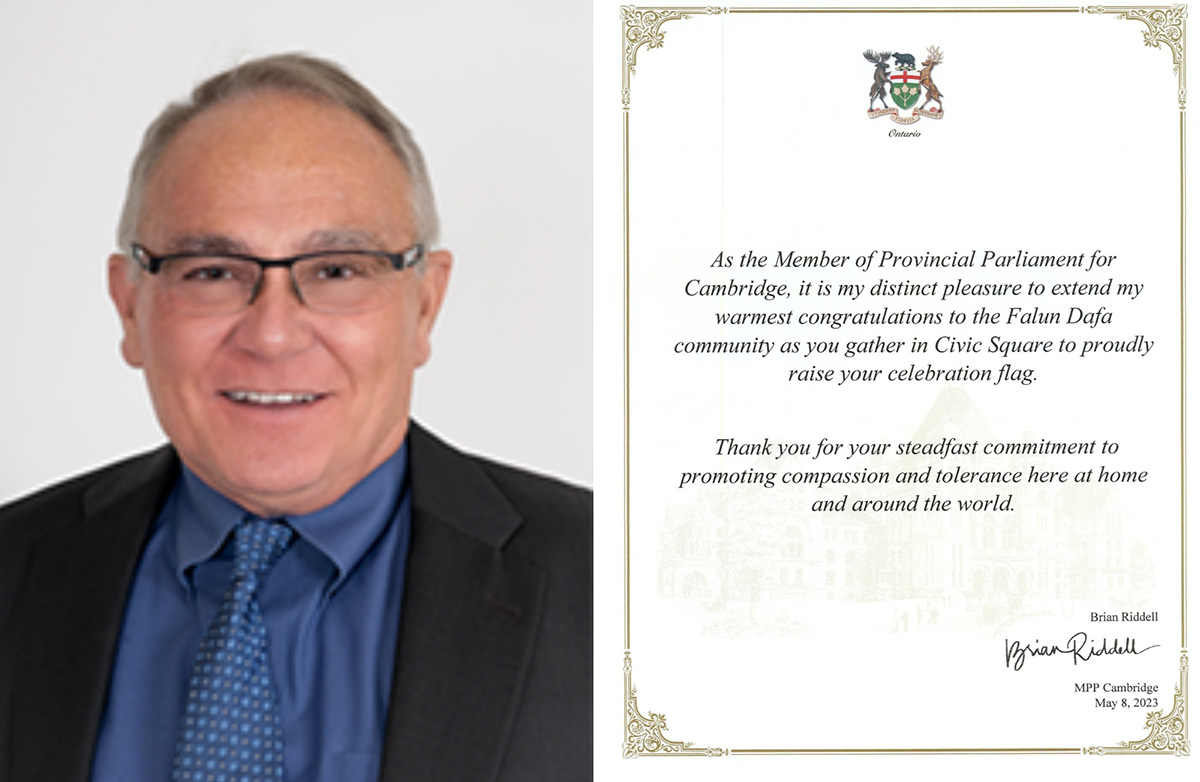 安省剑桥省议员布莱恩-瑞德(Brian Riddell)在贺信中说: