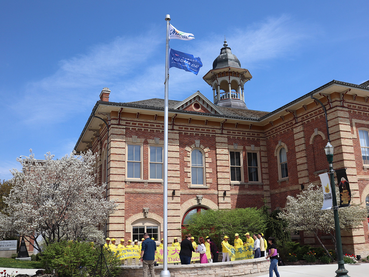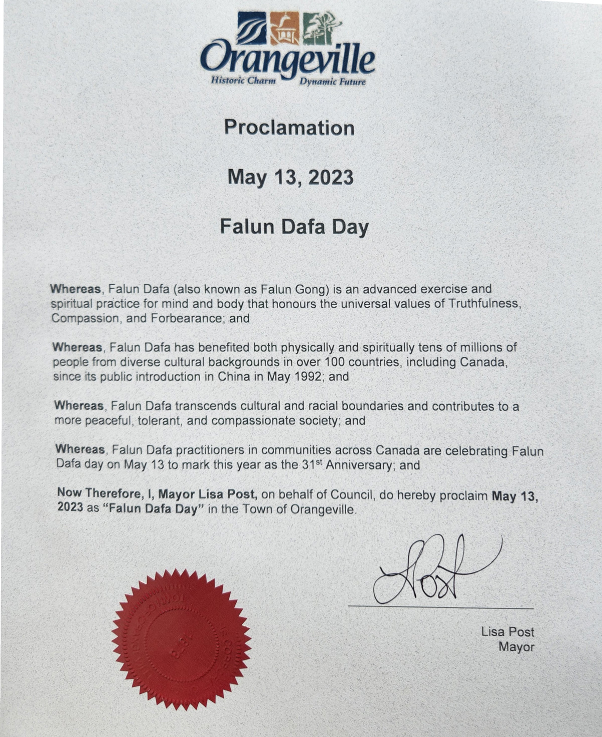 同日(五月十二日)上午十一点三十分,在奥兰治维尔(Orangeville)由市长丽莎·波斯特(Lisa Post)亲自主持升旗仪式,并宣布二零二三年五月十三日为奥兰治维尔镇法轮大法日。