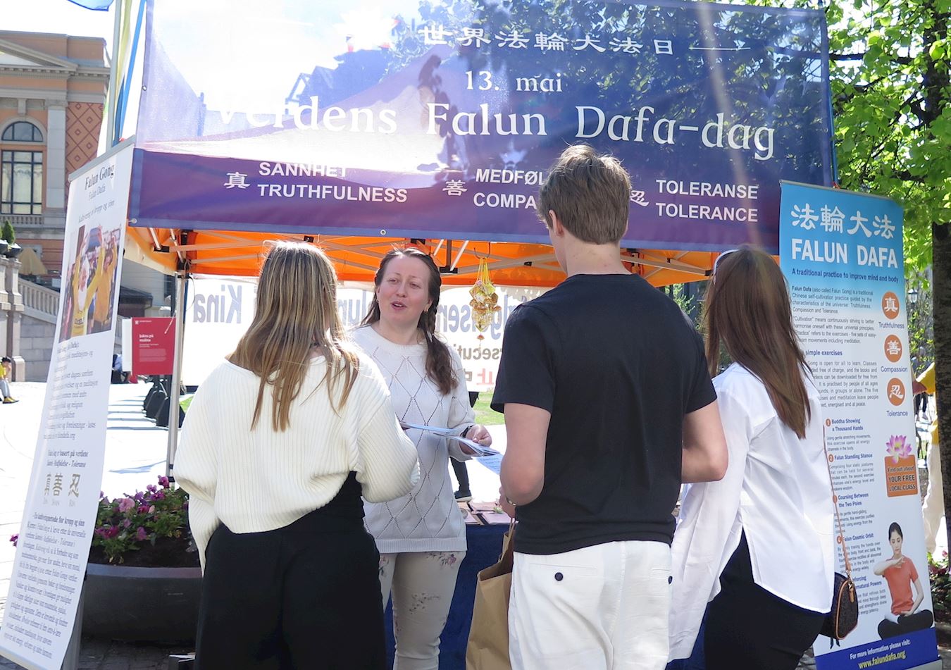 五月十三日也是挪威首都奥斯陆一年一度的霍尔门科尔滑雪跳台马拉松接力赛的日子。国会坐落的奥斯陆游行大街卡尔约翰大街比普通周六热闹了许多。法轮功学员的摊位迎来了许多想要了解法轮功的民众。