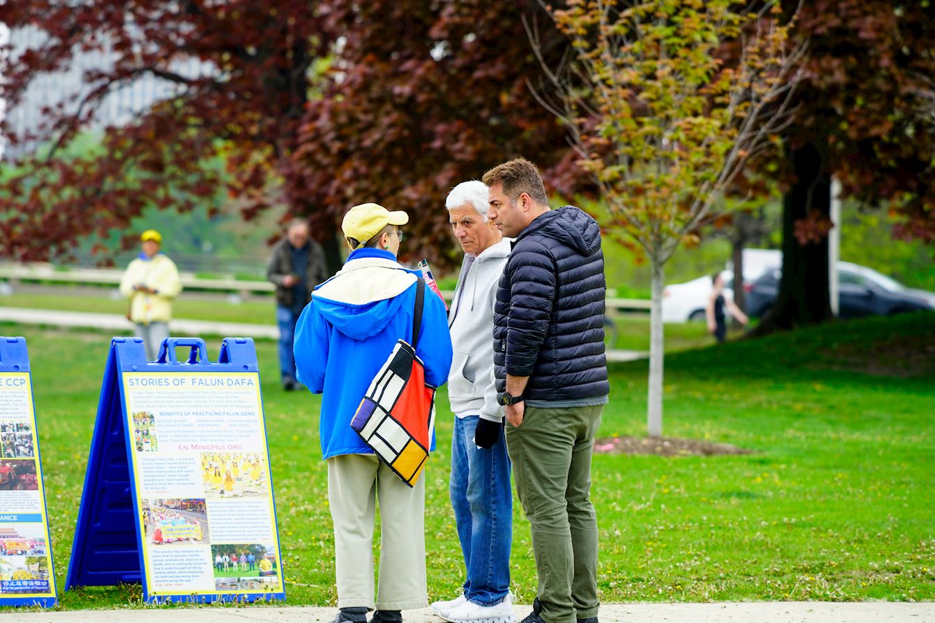 法轮功学员祥和优美的炼功场,吸引了很多附近的居民和游客驻足观看,许多人主动了解法轮功。