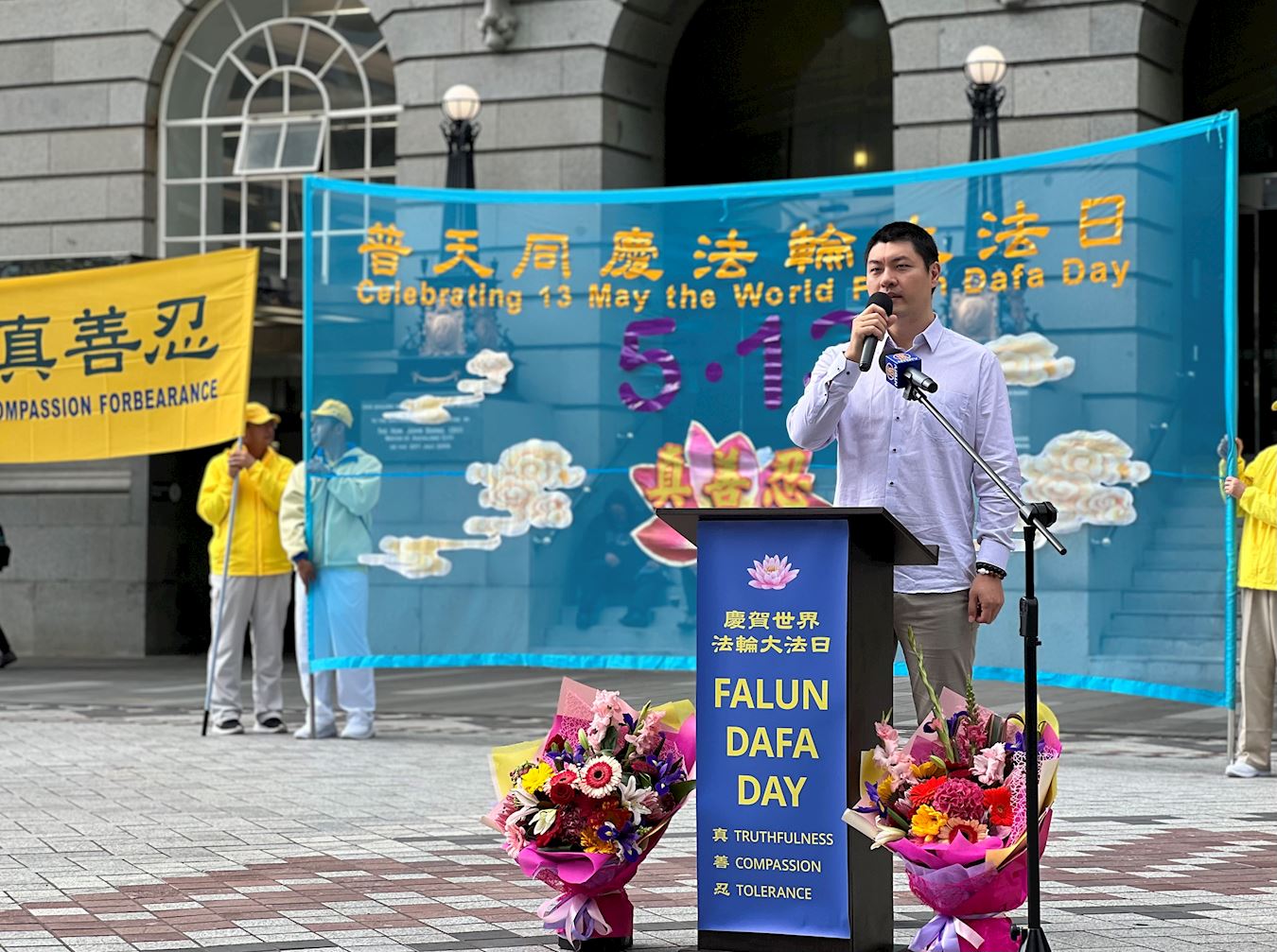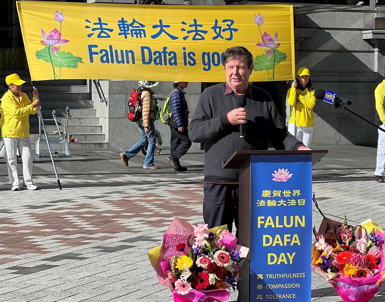 他接着说:“如果中国社会将来还有希望,那么,这一定是人们开始拥抱法轮功坚持的真、善、忍的处事原则。对于我们生活在西方民主社会的人们来说,这些普世价值一样对社会是百利而无一害。在此,我们真的是要为法轮功学员多年来的坚持而鼓掌,他们将如此有价值的信息传播到世界各地。今天,的确是值得庆祝的一天。”