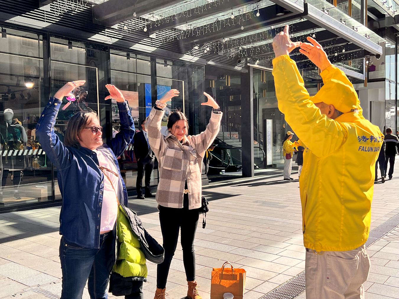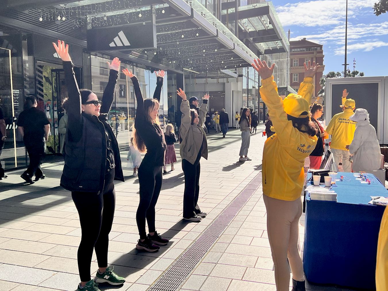塔妮(Tahnee)、费莉西蒂( Felicity )、特雷斯(Therese )是好朋友,也是同事,她们是做社交媒体营销的。她们一起很认真地学炼法轮功功法,还开心的说道:“这套功法很好,简单易学,而且能量场很好,让我们感到很放松。今天早晨我们不是很开心,想出来散散步。看到了他们在炼功,我们也想试一试,因为以前我们一直想坐下来冥想。学完功后,好象一下子什么都好起来了,改善了我们一天的心情。”