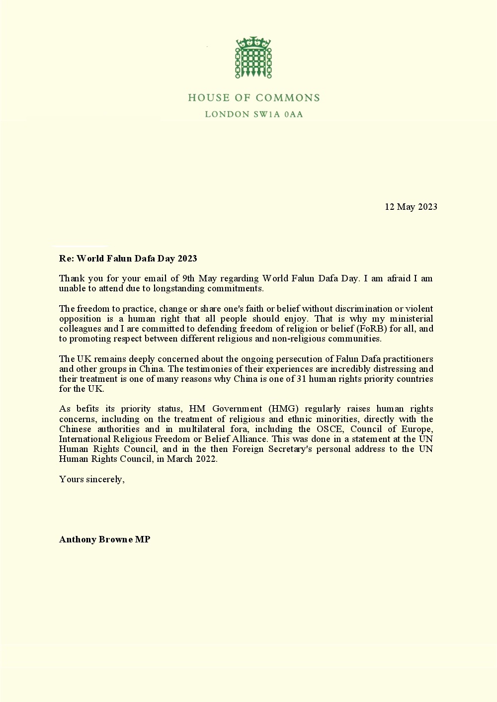 “因此,我很高兴您能够在英国这里自由的修炼,并能够在五月十三日庆祝(世界法轮大法日)。”