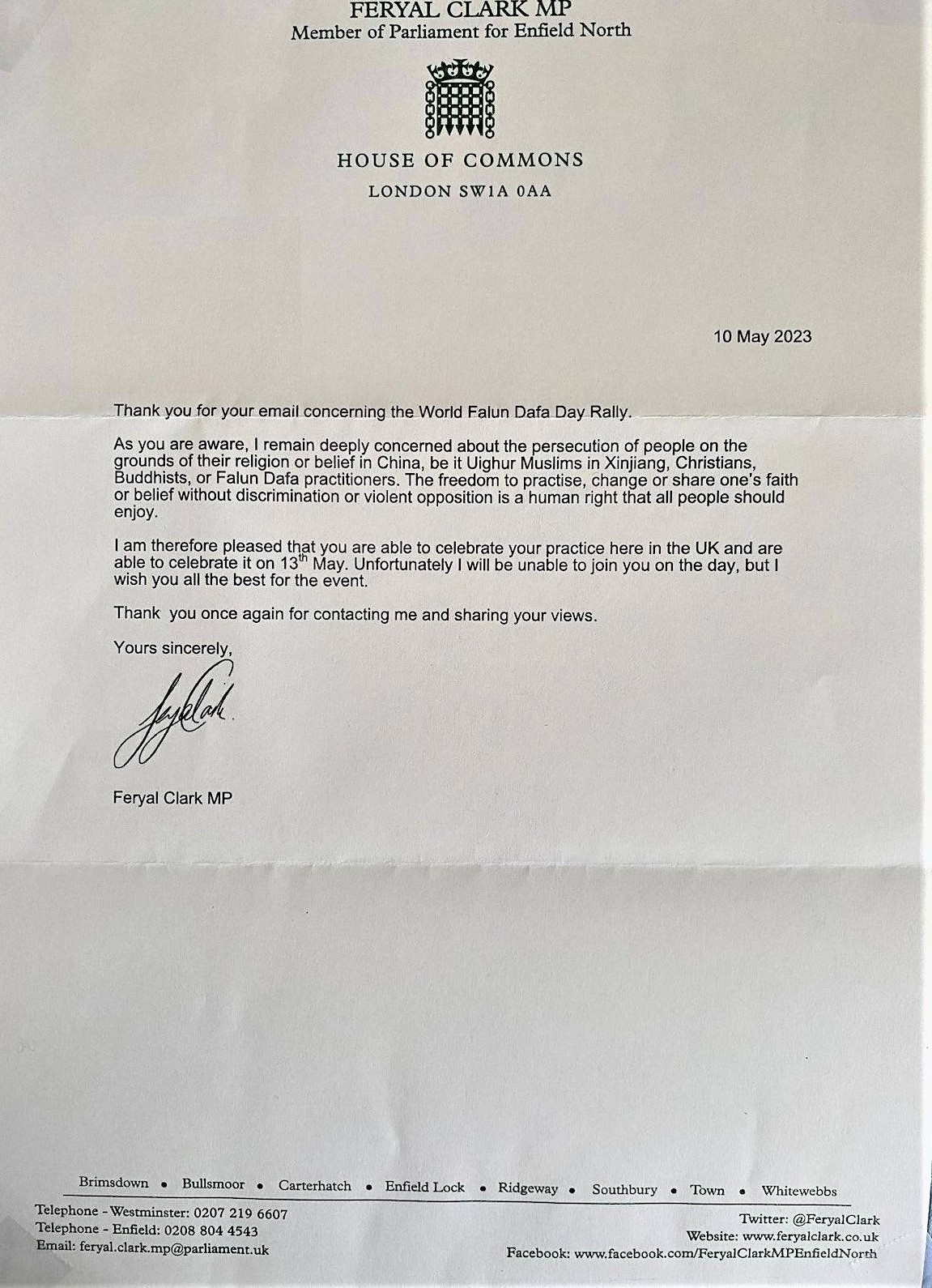 费尤·克拉克议员(Feryal Clark, MP)发来书面信函,在信中写道: