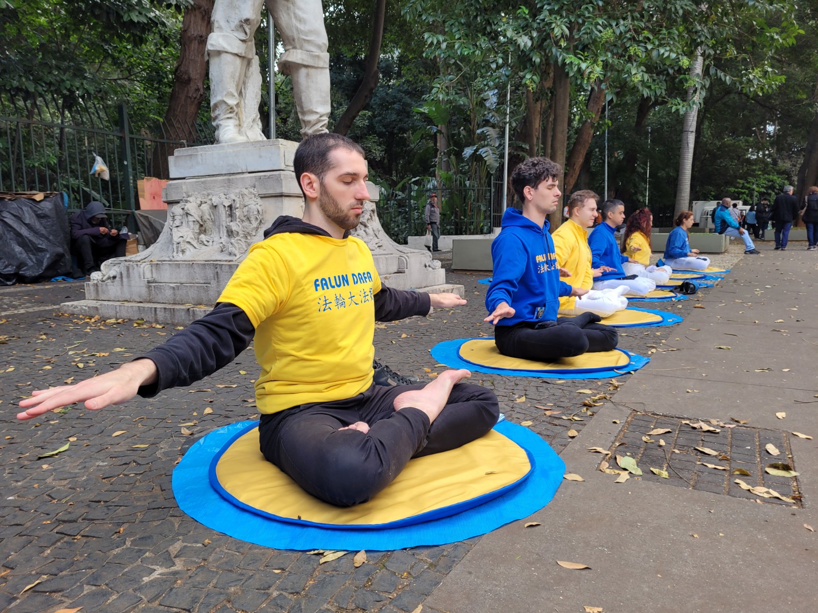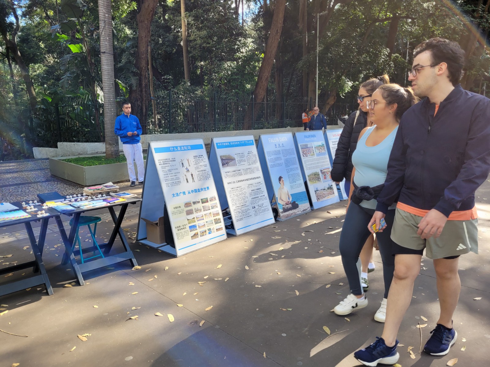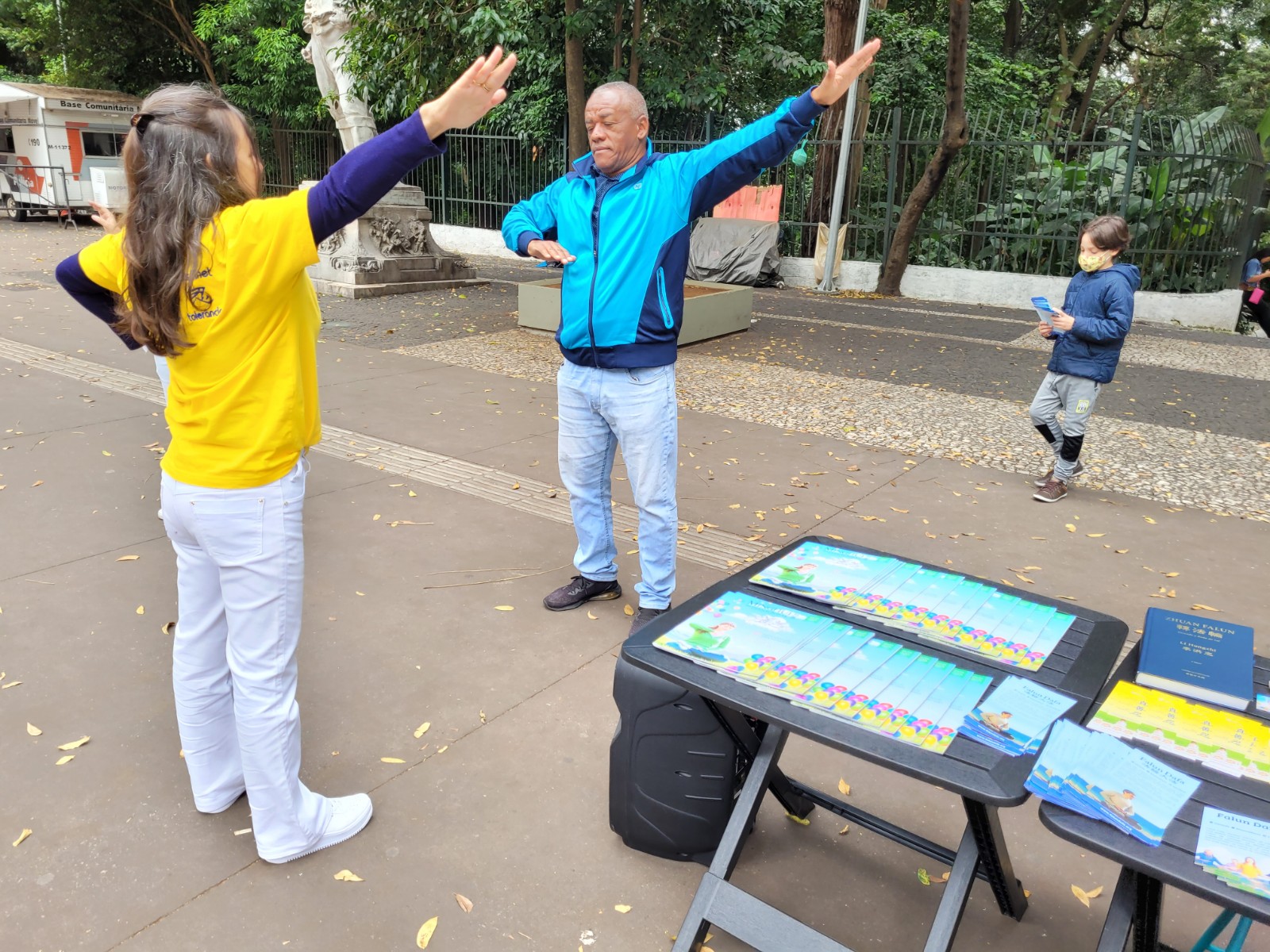 圣保罗人大道(葡萄牙语:Avenida Paulista)是圣保罗市最重要的观光景点和娱乐中心之一,这里每天都会吸引大量游客前来观光购物。当天,学员们向过往民众展示法轮功五套功法,并介绍了法轮大法弘传世界的盛况以及中共在中国对法轮功的迫害。过往行人纷纷驻足了解法轮大法。