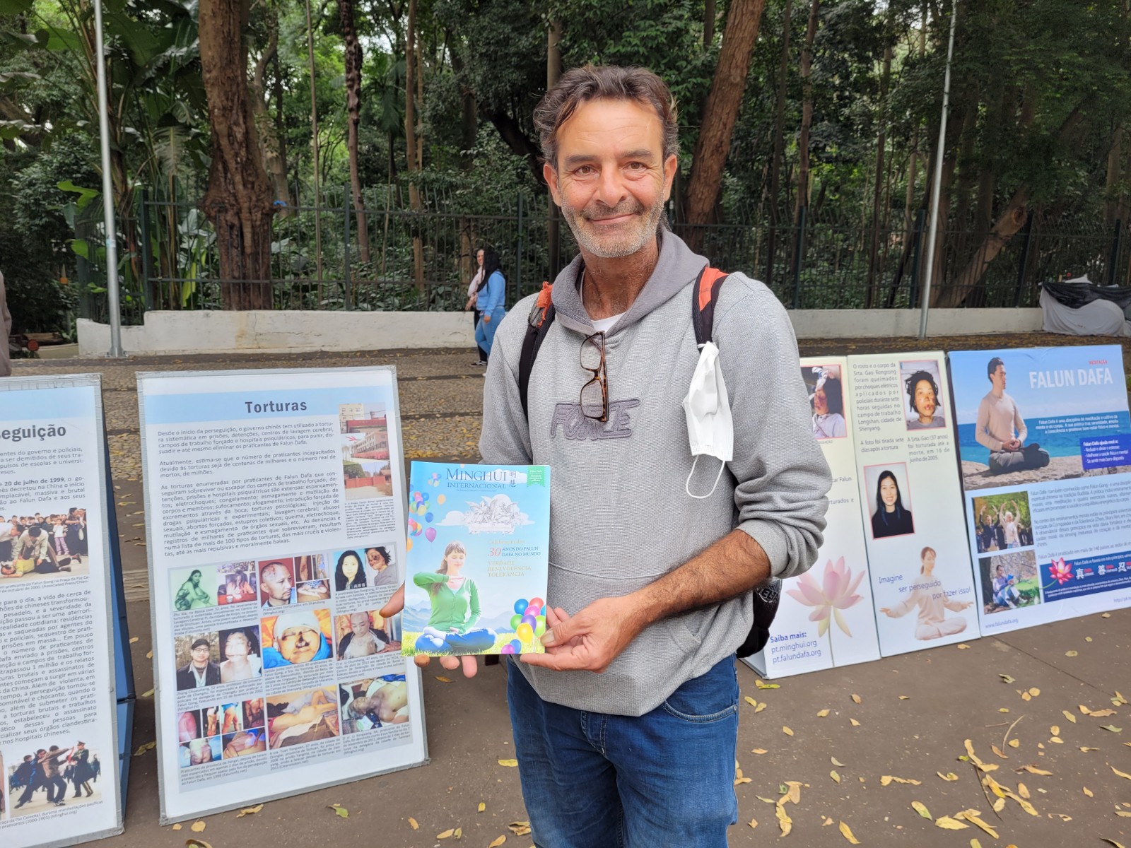 二十六岁的贝尔纳多·舒格斯(Bernardo Schotgues)从事教育行业,同时也是神经心理学在读硕士研究生,二零二二 年 一月开始修炼法轮大法。当天他和另一位同修驱车七小时,从巴西的另一座城市库里蒂巴(Curitiba)来到圣保罗参加活动。