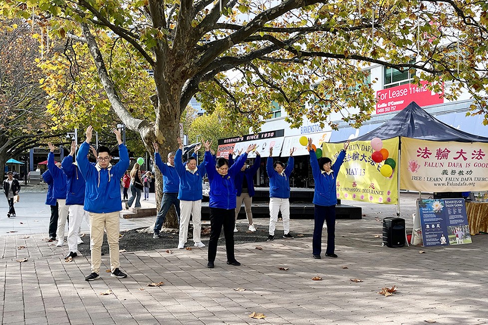 ![]() 图1:法轮功学员向市民们展示法轮功五套功法。 |