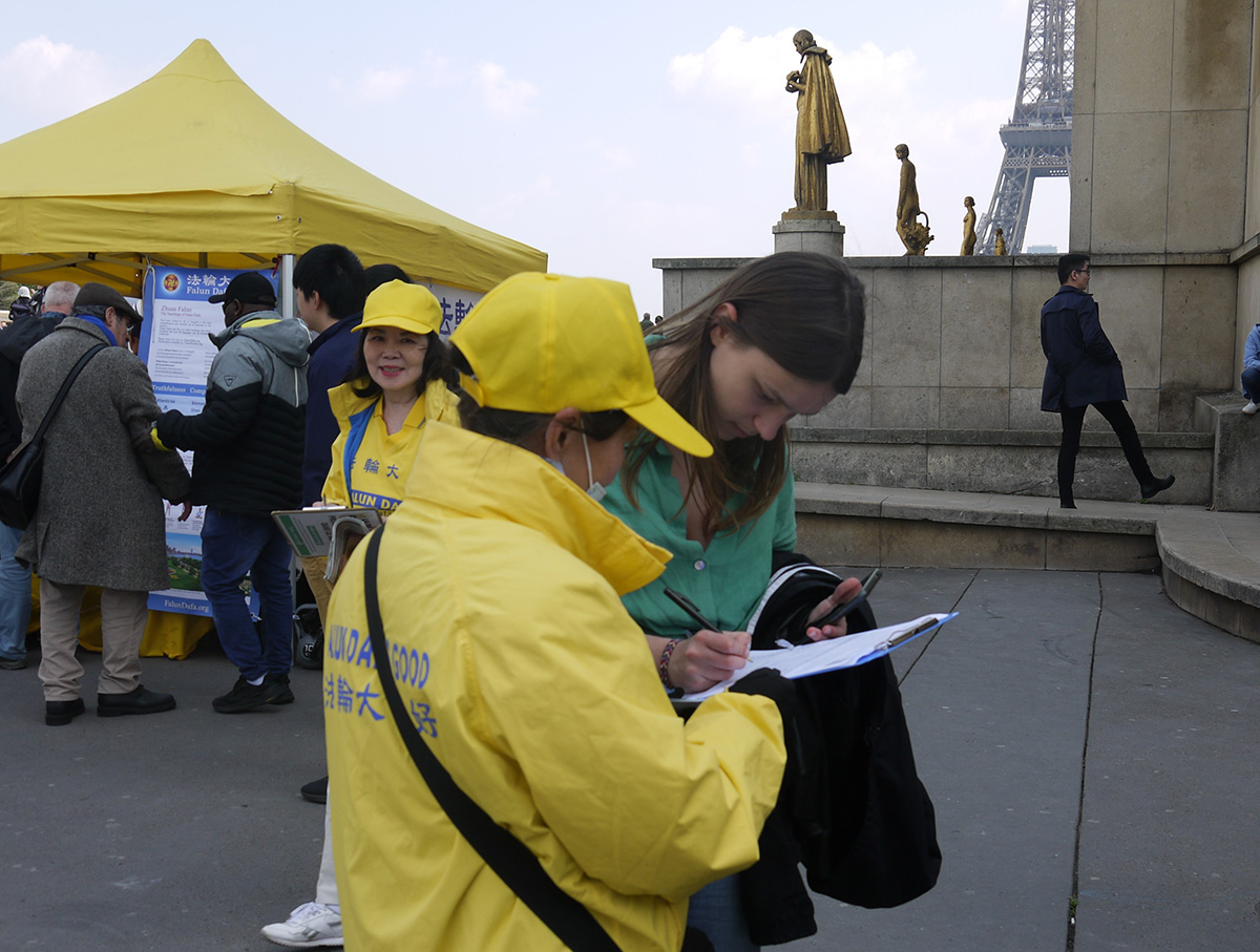 巴黎华人叶女士住在铁塔附近,她找到法轮功学员,她诉说了自己被中共逼迫地倾家荡产的经历,现在只好逃到了法国。她说,中共很没有人性。她请法轮功学员帮她做了三退。