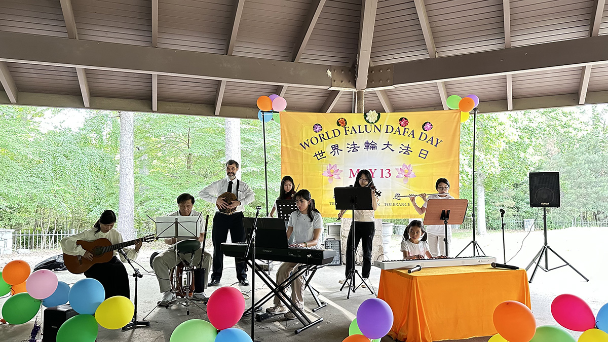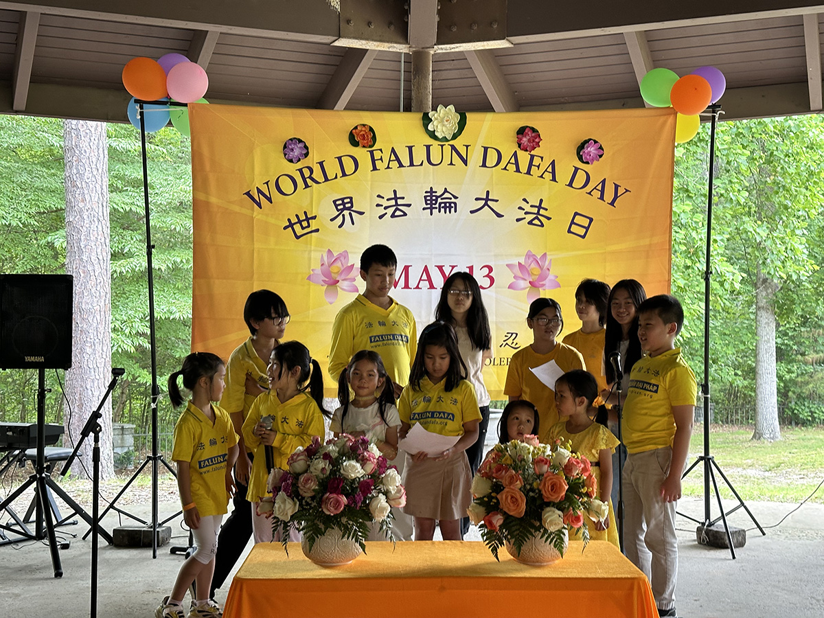 炼完五套功法后,所有参与活动的学员都到公园的一个大凉亭下,举行庆典活动。大法小弟子们用中文及英文背诵《洪吟》,然后由九名不同族裔学员组成的乐团为大家演奏了法轮功学员编写的乐曲以及两首欧洲古典乐曲,其中包括《得度》、《法轮大法好》等乐曲。最后的压轴节目是大合唱《师恩颂》和《法轮大法好》。