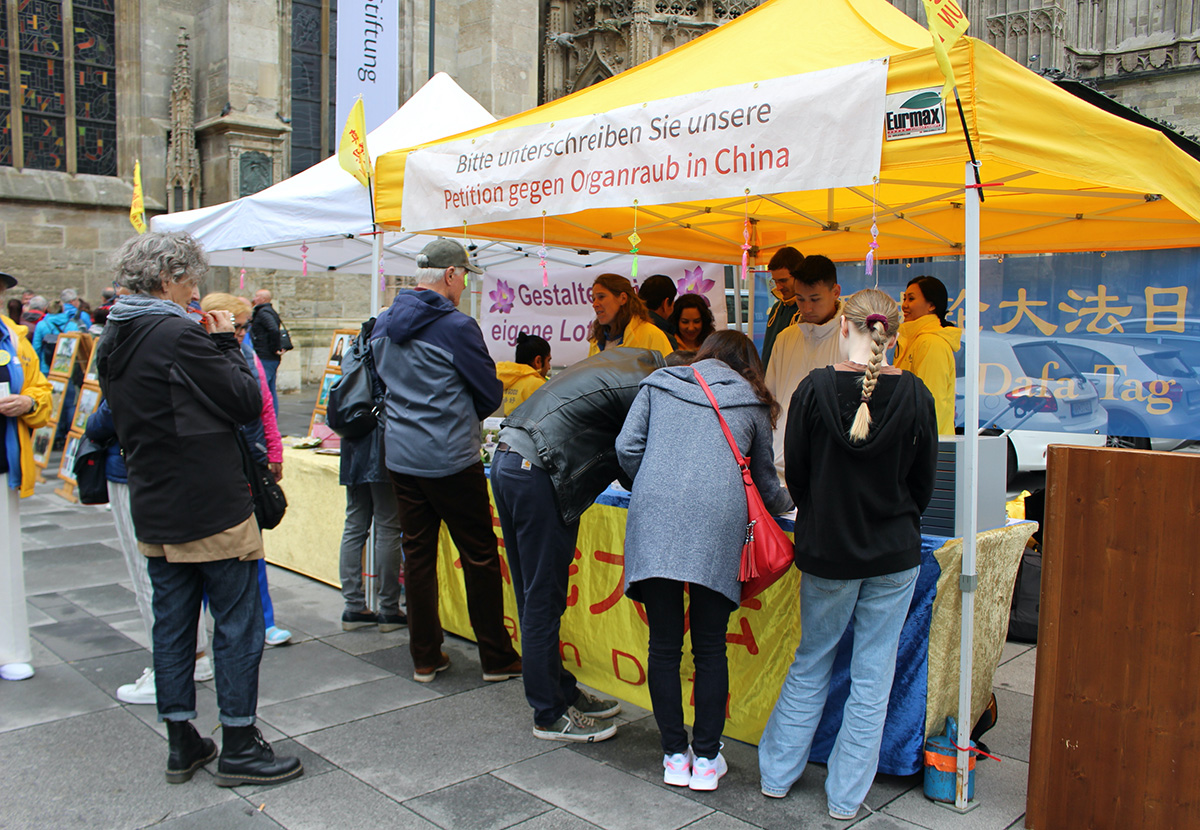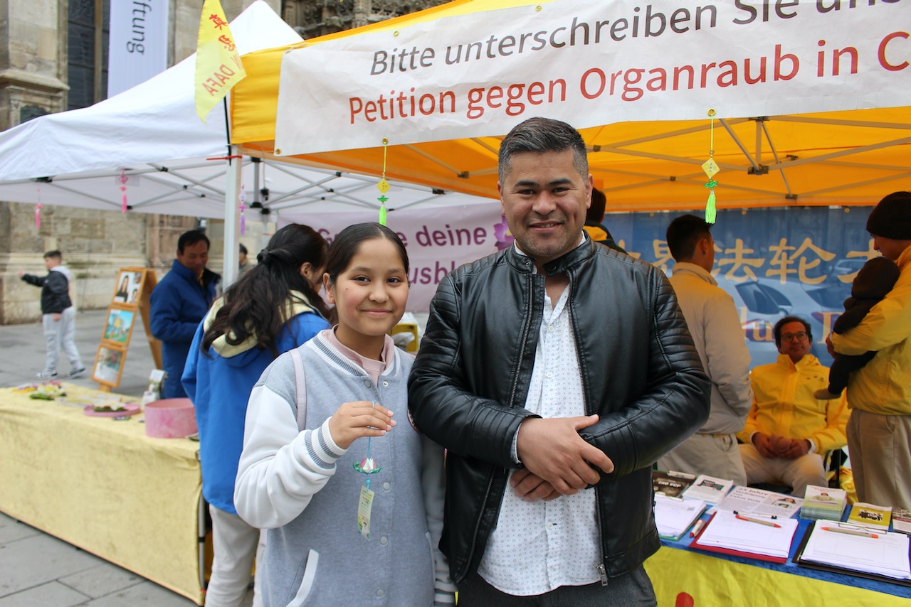 在展台前,很多民众通过深入的对话了解了法轮大法的真相。许多人在结束中共迫害的请愿书上签名。一位来自阿富汗的先生带着他的孩子来到咨询台前,第一次听说了法轮大法。他说,真善忍的法理和改善身体健康的气功锻炼都是很好的。为什么会被(中共)迫害呢?他想鼓励中国的法轮功学员:在经历了所有的苦难之后,一定会有一个好的结局,他对此深信不疑。