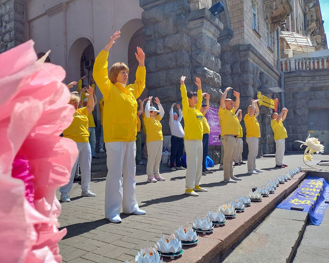 五月的基辅阳光明媚,绚丽的板栗花开满街道,市政厅对面就是法轮功学员的庆祝地点,这里成了当天最美的一道风景线。