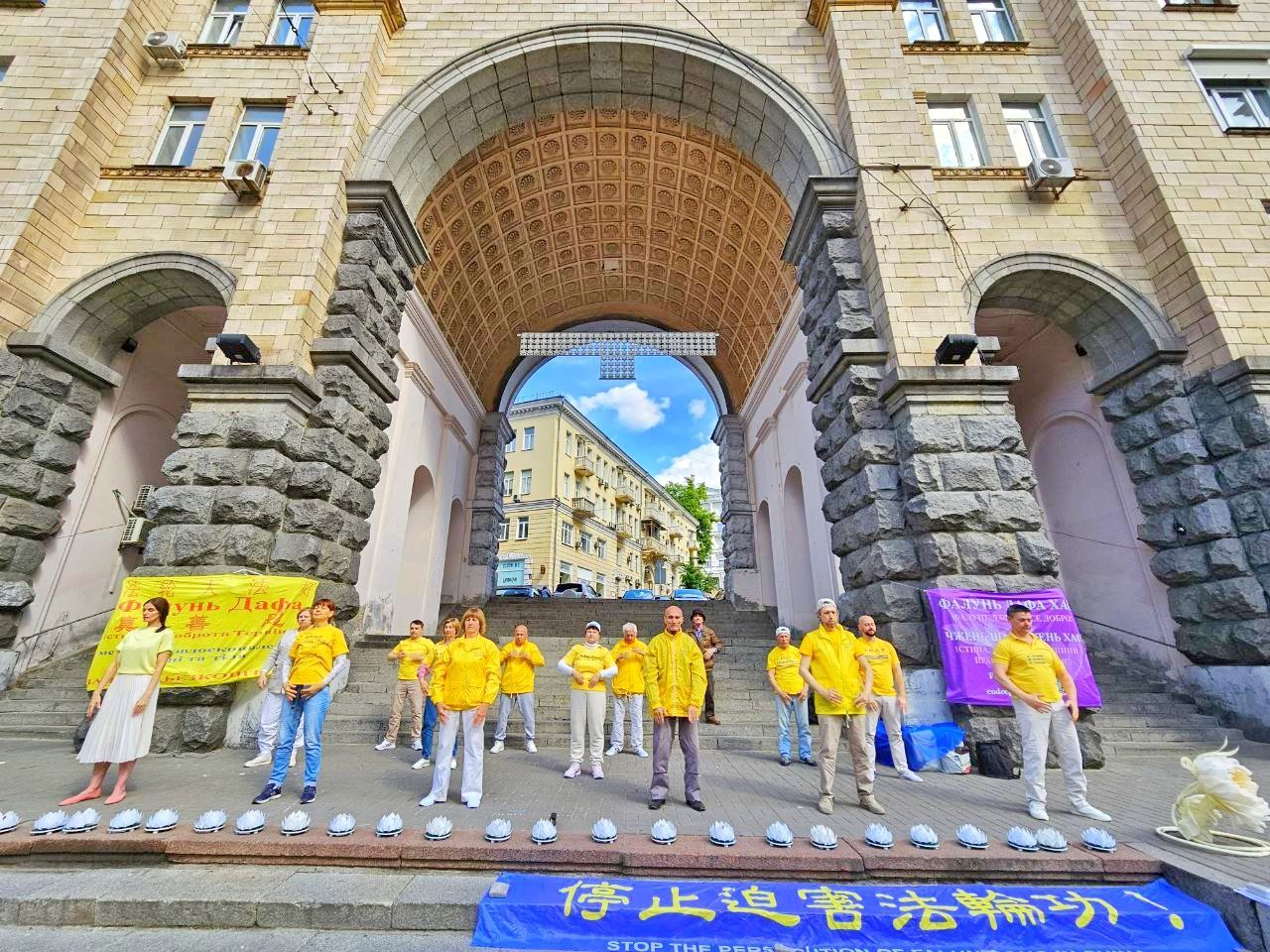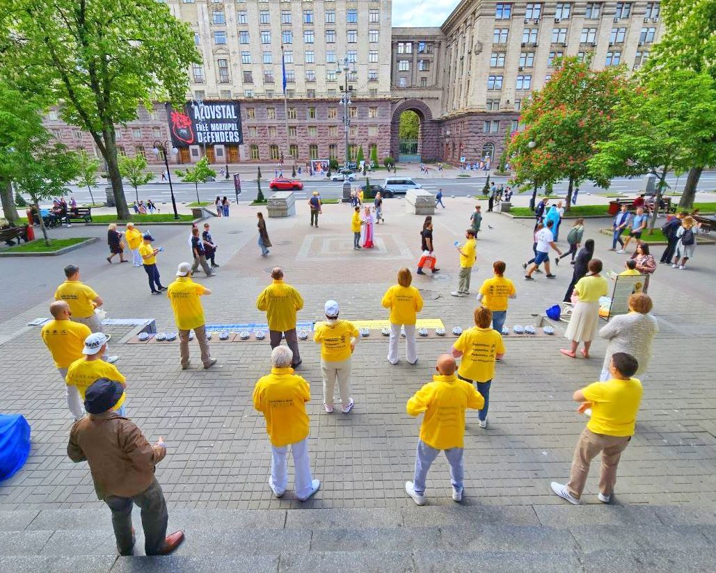 ![]() 图1~4:庆祝世界法轮大法日,二零二三年五月十三日,来自基辅及其他城市的法轮功学员集体炼功,向过路的民众讲述大法的美好,同时呼吁停止迫害 |