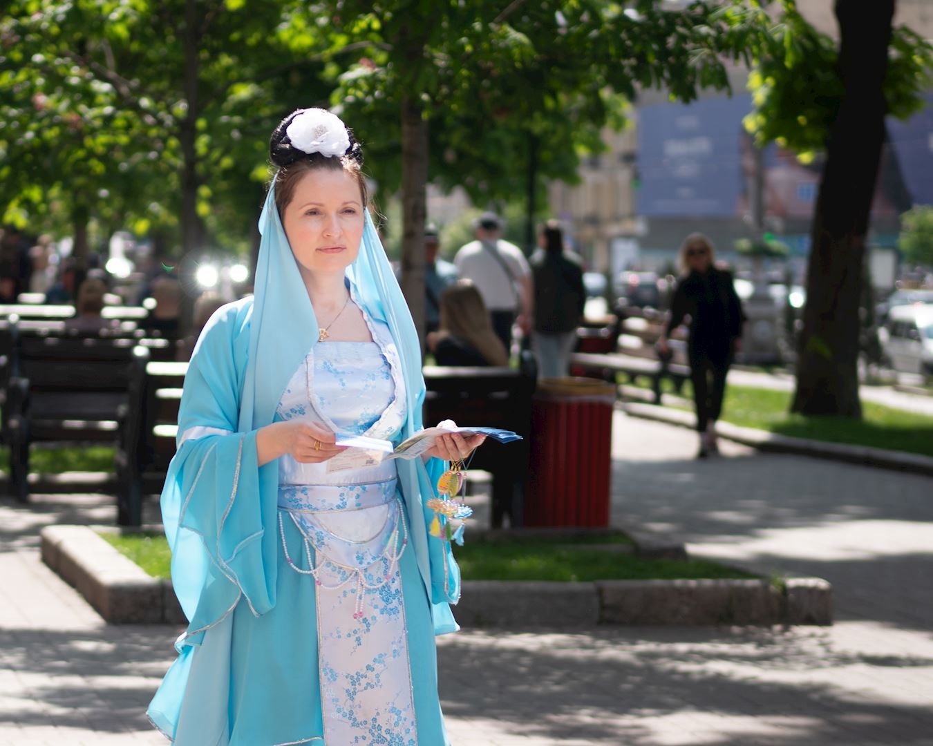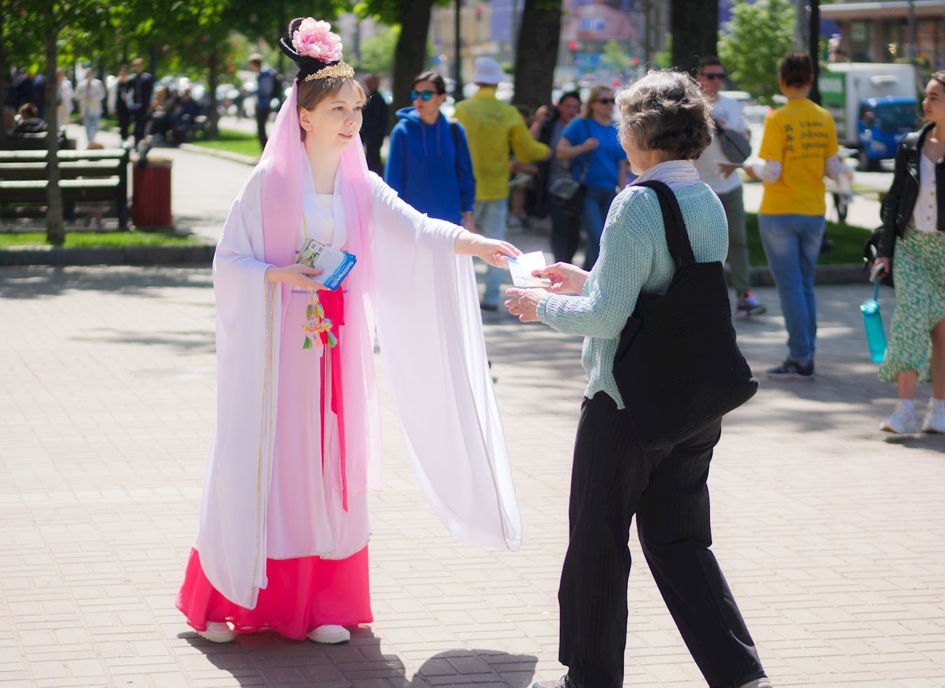 许多路人被当天的活动所吸引,不断有人停下来询问,还和身穿仙女服的法轮功学员合影留念。