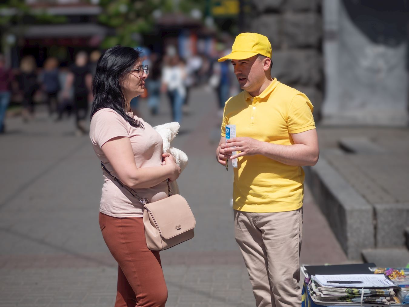 一位在乌克兰议会工作的女士和法轮功学员聊了很久,她接过学员发的报纸,说她会看这份报纸。过了一会,她又回来了,她说已经读了报纸,她想在请愿书上签名,反对中共对法轮功的迫害。