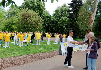 一位小伙子远远看到法轮功学员炼功的场面就赶过来对学员说:“几年前我在这里学过两次,后来因工作原因去了别的国家,现在终于又回来了。真高兴看到你们还在这里义务教功。我把工作安排好后一定会再来这里学功。”