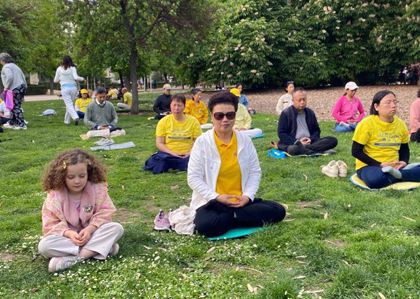 一个可爱的小女孩和妈妈一起游玩,学员们炼功的场面吸引了小女孩的目光,她停下脚步静静地看着,妈妈几次催也不走,后来小女孩索性跑到学员旁边也跟着学员打坐,一直到炼功音乐结束才跟着妈妈恋恋不舍地离开。
