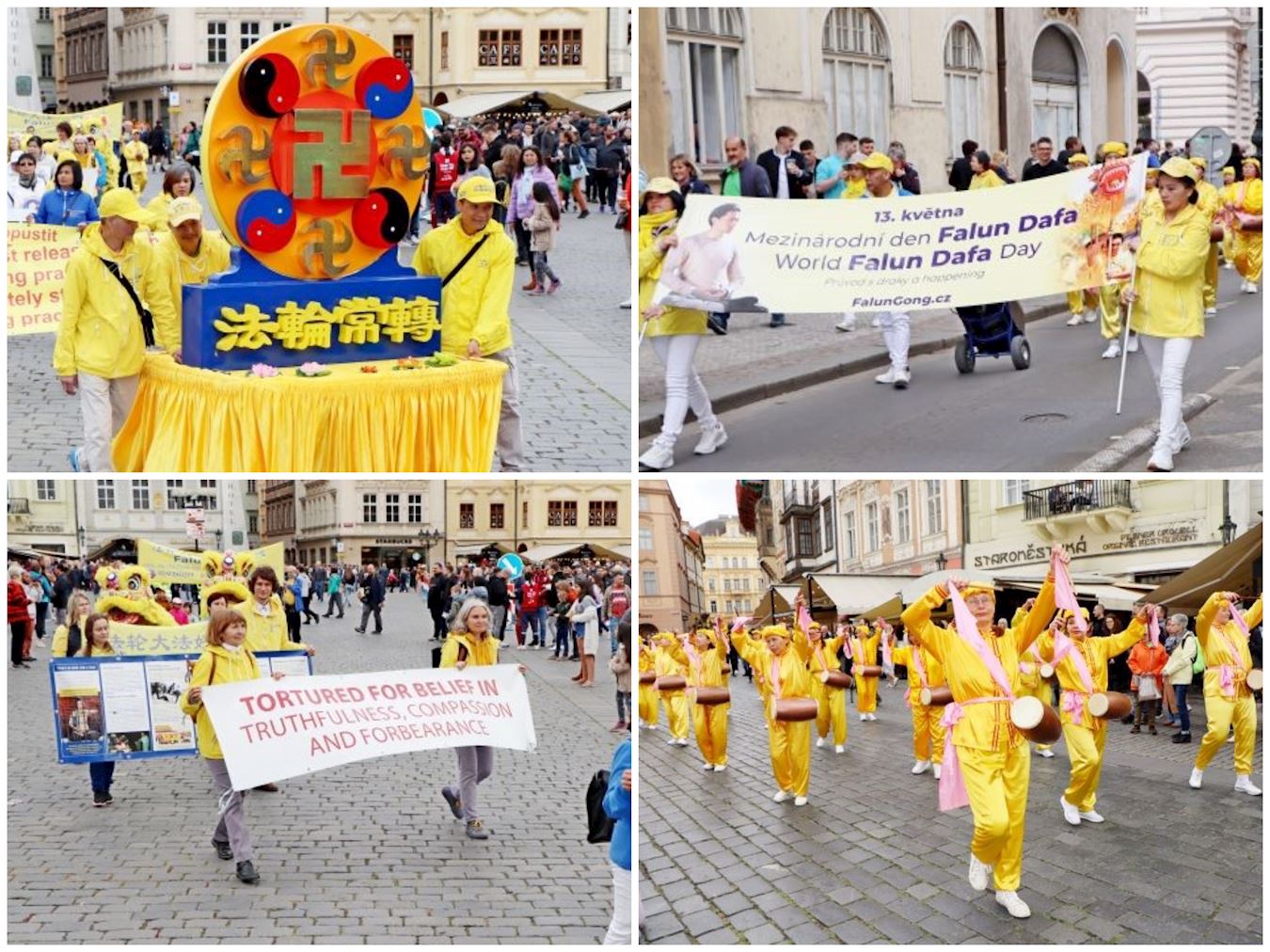 庆祝法轮大法日活动中,法轮功学员进行功法演示,舞龙和舞狮,腰鼓队和仙女舞蹈表演展现法轮大法的美好。随后,学员在布拉格市中心举行游行,吸引众多市民和游客驻足观看,很多人拍照留念,有的前来了解真相,有的向学员询问学功信息。