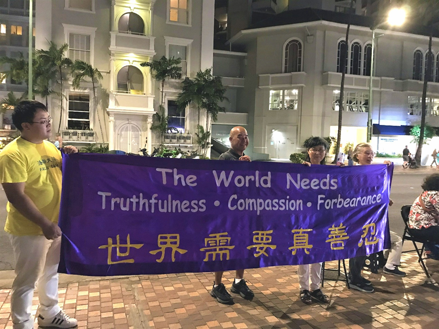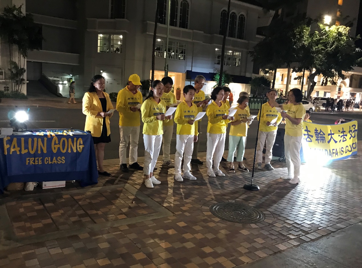 卡拉卡瓦大道被认为是夏威夷的购物天堂,吸引着来自世界各地的购物者。每天晚上都有民间艺人以各种形式展示才艺,是游客们到夏威夷度假的必访之地。在喧嚣的车流、行色匆匆的旅步中,法轮功学员平静、祥和的演示着五套功法。那种关注生命内在的宁静在不知不觉间印刻进游客一走一过的记忆中,吸引着民众驻足观看,录影录像。