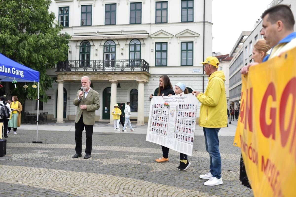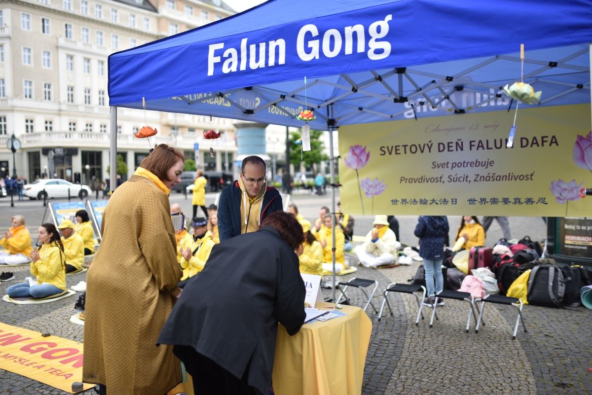 这次活动在斯洛伐克首都布拉迪斯拉发的赫维兹多斯拉夫广场举行,斯洛伐克共和国国民议会议员彼得·奥苏斯基(Peter Osuský)到现场发言。他向法轮功学员表示致敬,并呼吁民众抵制中共对法轮功的迫害。