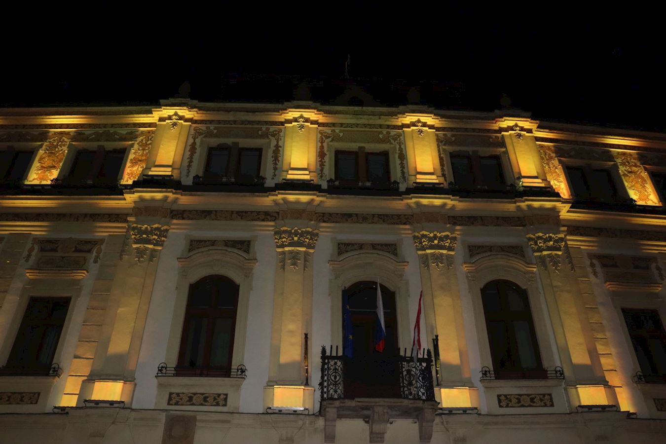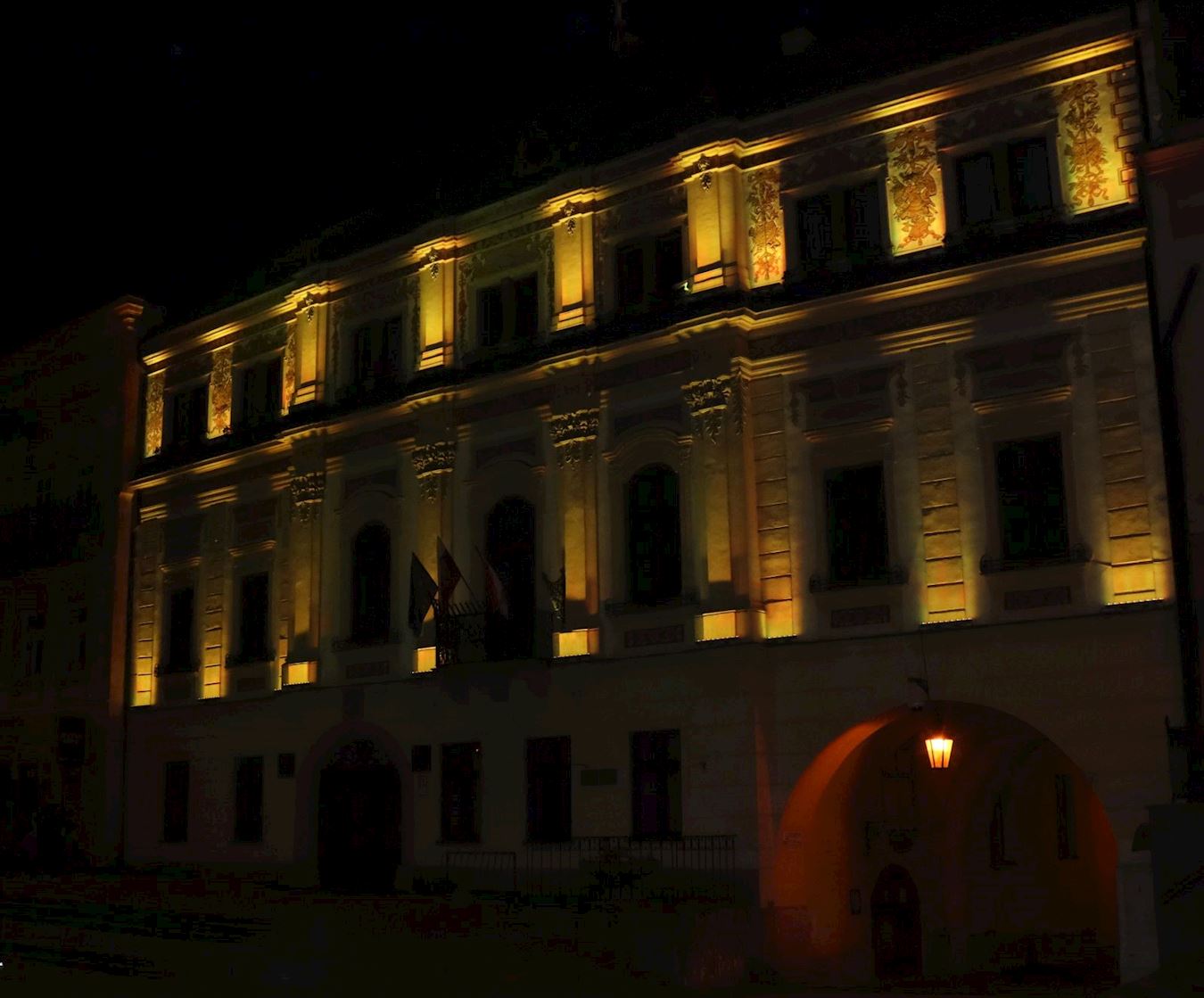 ![]() 图4~5:当天,斯洛伐克普雷索夫市政厅特别点亮金黄色的灯,以表达对法轮大法日的声援。 |