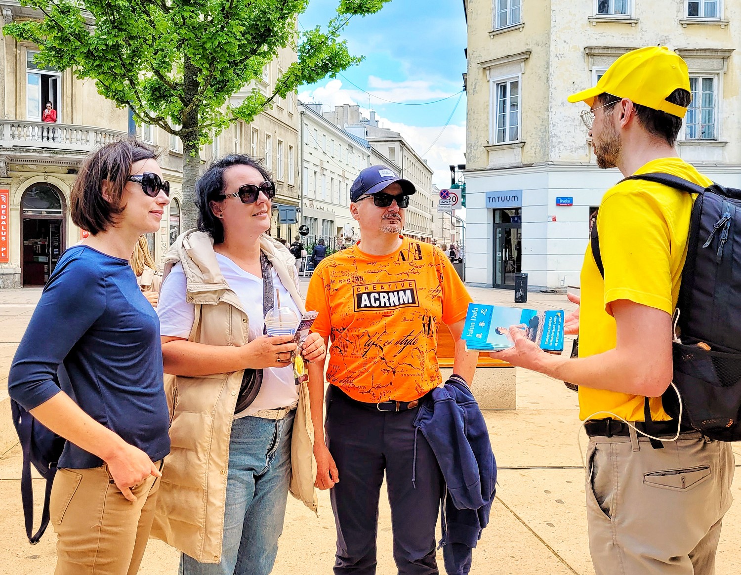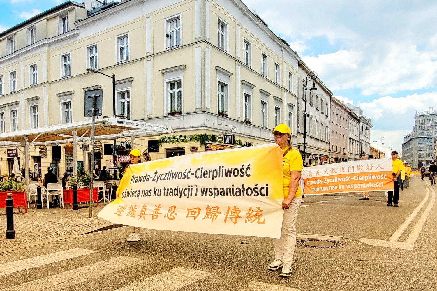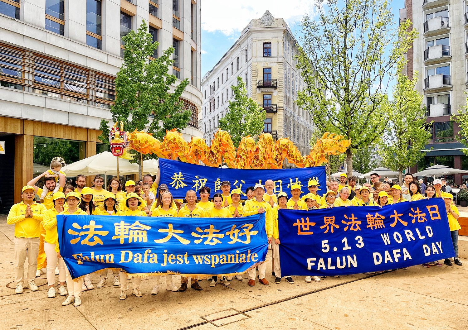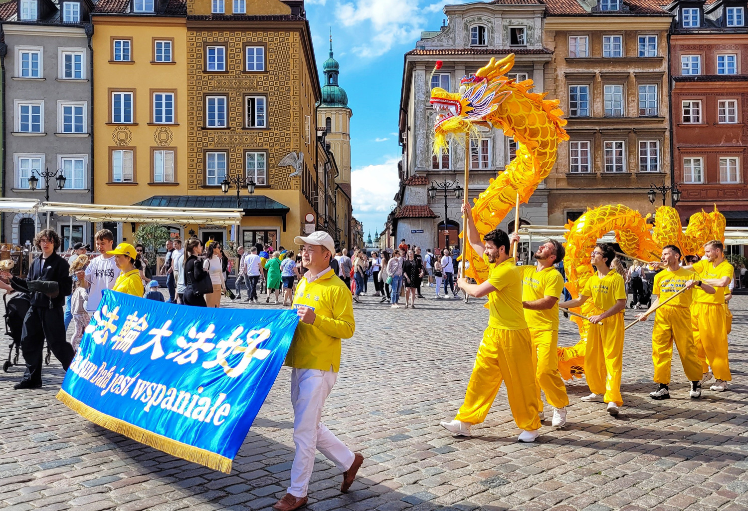 游行队伍随着欢快的锣鼓声起,率先从华沙五街口广场(Plac Pięciu Rogów)出发,一面“法轮大法好”横幅首先映入民众的眼帘,而后上下飞舞的金龙在湛蓝的天空下闪闪发光。“法轮大法教我们真、善、忍”、“停止迫害法轮功”等横幅。