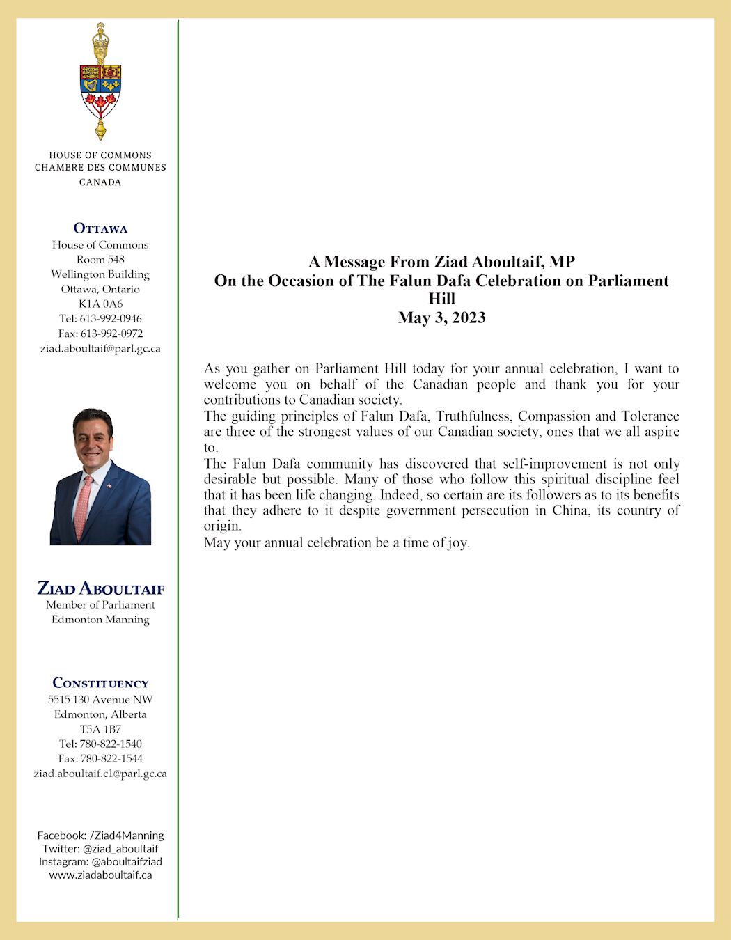 埃德蒙顿(Edmonton)国会议员Ziad Aboultaif 赞扬法轮大法给加拿大社会所做的贡献。他表示法轮大法真、善、忍的原则也是加拿大社会普遍尊崇的重要原则。法轮大法团体通过实践证实自我提升不仅可取并且可行。许多人通过修炼感受到了人生的转变。尽管在法轮大法的发源地中国,迫害仍在进行,但修炼者依然在坚定地修炼并从中获益良多。