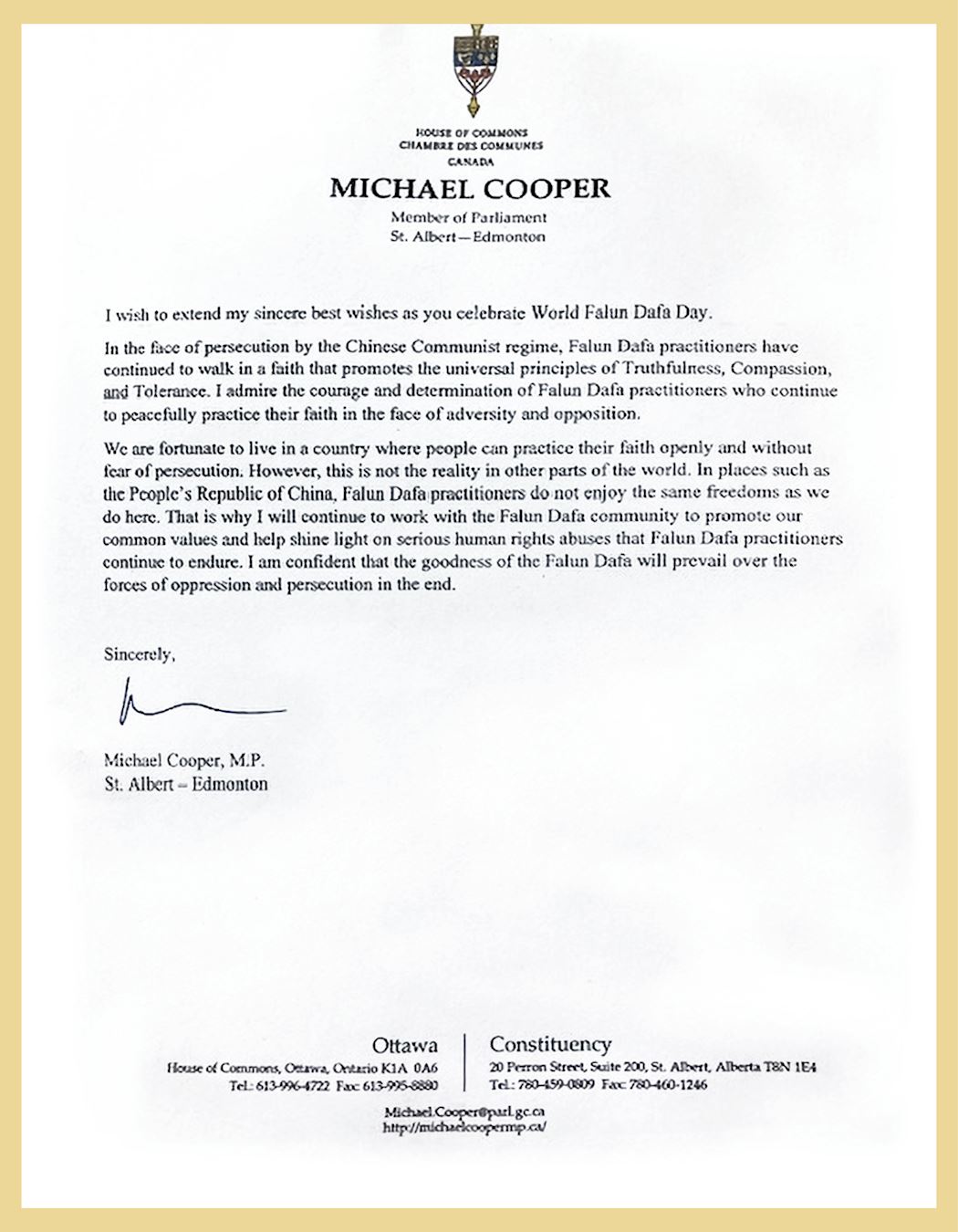 埃德蒙顿(Edmonton)国会议员Michael Cooper赞佩法轮大法修炼者面对中共的迫害仍坚守真、善、忍的信仰,在逆境和反对面前仍继续以和平的方式践行信仰的勇气和决心。他表示将继续帮助揭露法轮大法修炼者所遭受的严重迫害,促进共同的价值观。他坚信法轮大法修炼者的善良终将战胜压迫和迫害。