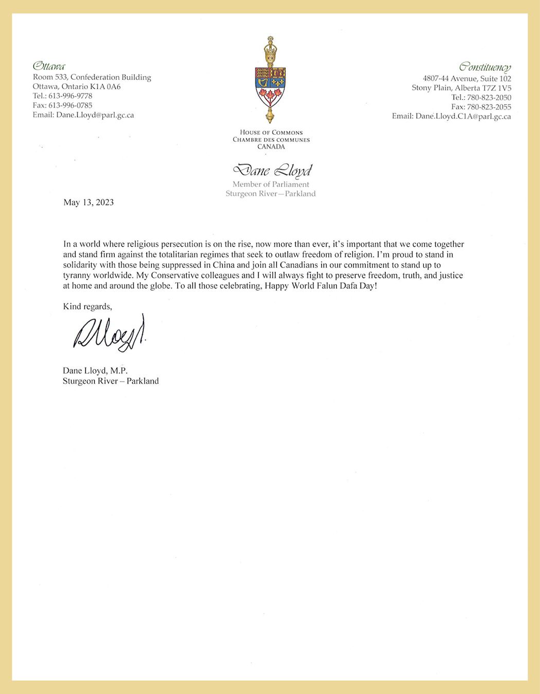 帕克蓝-斯德郡河(Sturgeon River - Parkland) 国会议员丹·罗伊德(Dane Lloyd)祝法轮大法日快乐。他认为在宗教迫害比以往任何时候都更为严重的当今世界,我们团结起来坚决反对试图取缔宗教自由的极权主义政权尤为重要。他为能够声援在中国受到压制的人们、并与所有加拿大人一起承诺抵制全世界的暴政而感到自豪。他表示将始终为维护国内和全球的自由、真理和正义而战。