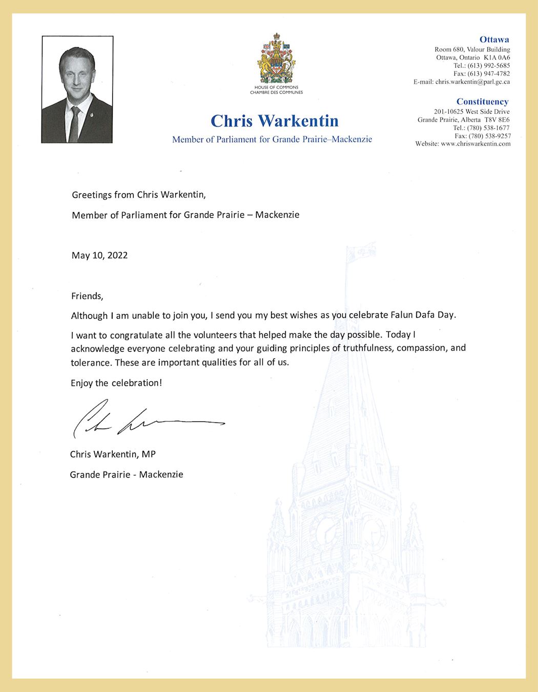 大草原-麦肯锡 (Grande Prairie - Machenzie)国会议员克里斯·沃肯汀(Chris Warkentin)向大法学员致以最诚挚的节日祝福,对真、善、忍的原则表示认同,并认为这些对我们所有人而言都是重要品质。