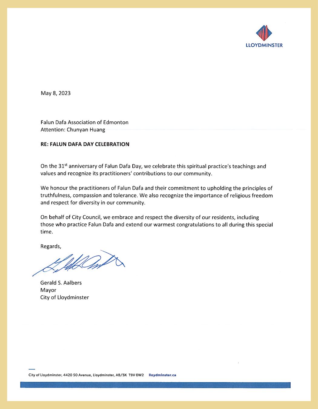 劳埃德敏斯特(Lloydminster)市长杰洛德·阿尔伯(Gerald S.Aalbers)代表市议会祝贺法轮大法日,赞扬法轮大法的教导和原则。对法轮大法修炼者遵循真、善、忍的原则表示尊敬,并感谢法轮大法对社区所做的贡献。