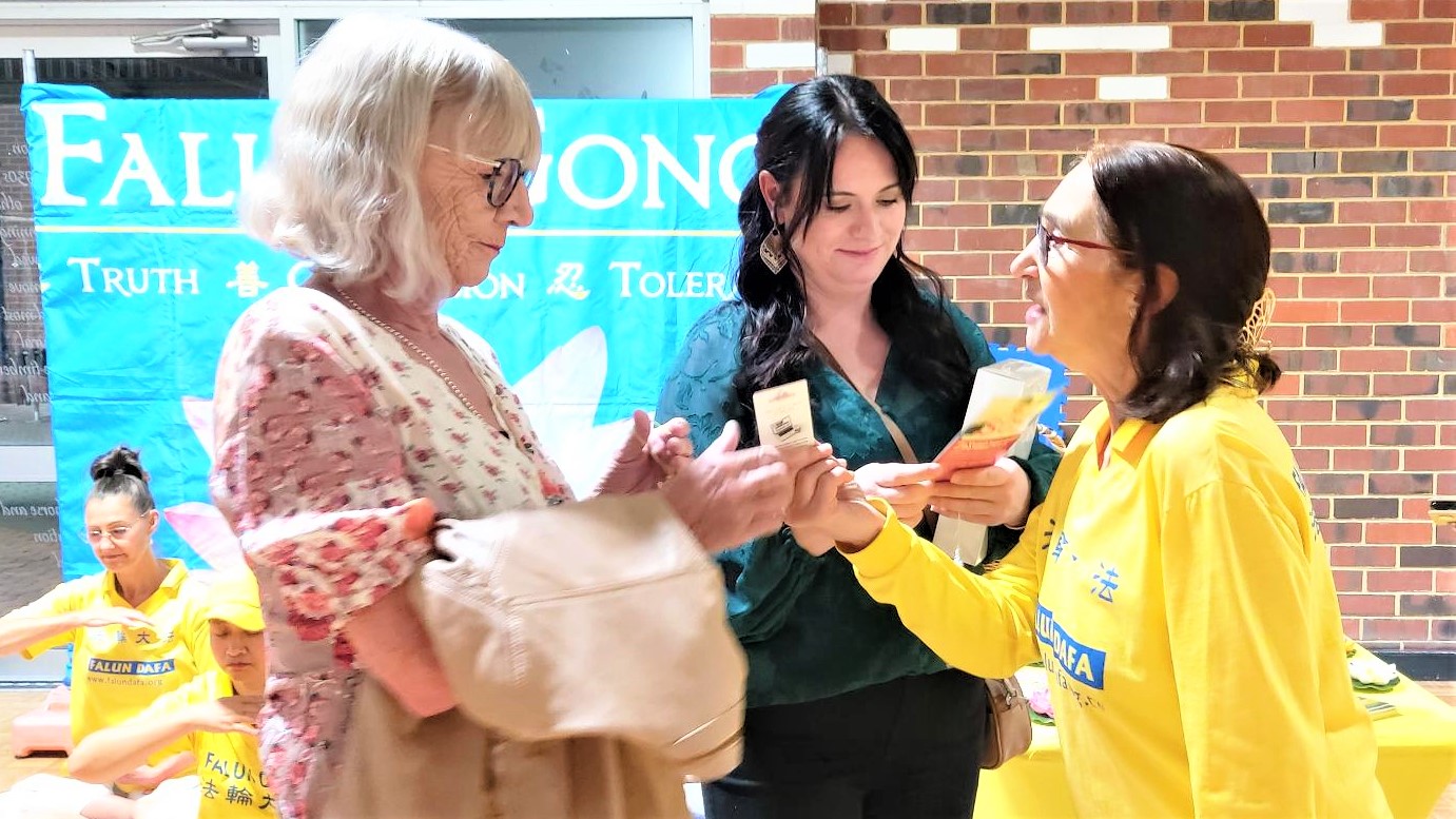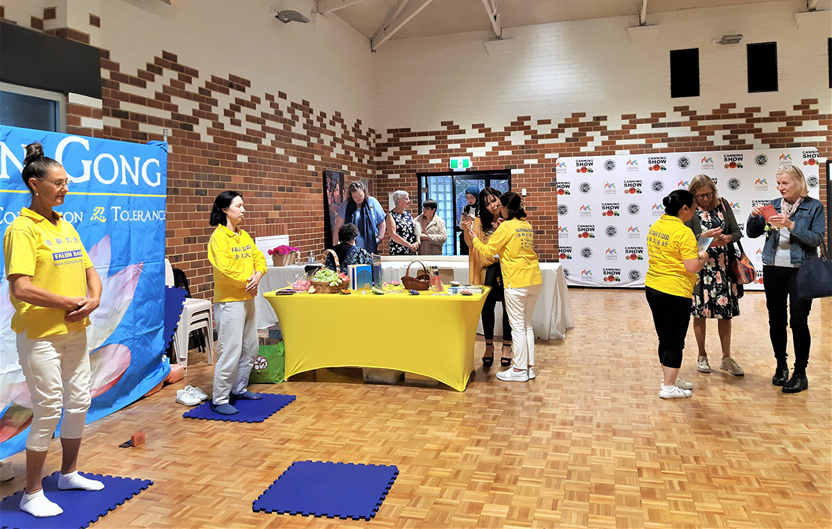 西澳法轮功学员在展位上向人们介绍法轮功,演示优美祥和的五套功法,并在舞台上为宾客带来了精彩的中华传统腰鼓表演。有的宾客表示,法轮功学员的腰鼓表演,让她们很感动。还有不少宾客对法轮功感兴趣,询问有关信息,想要学炼功法。