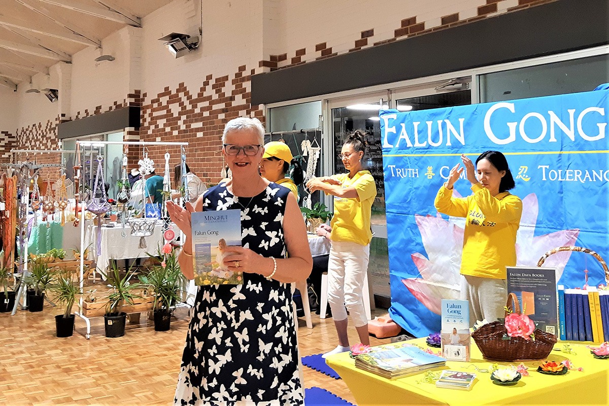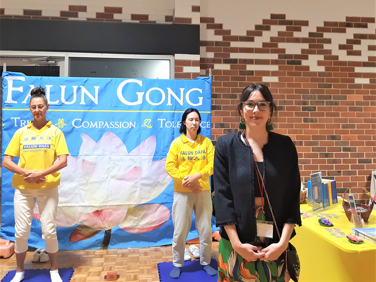 协会管理人员瑟琳娜·比尔斯利(Serena Bearsley)在法轮功展位驻足,她表示法轮大法的能量场非常美好,她说:“我喜欢法轮大法真、善、忍的原则。我们都需要真、善、忍,这很重要。我们需要对自己保持诚实,因为如果你对自己撒谎,你就会开始对别人撒谎,你就会失去真正的自己。”