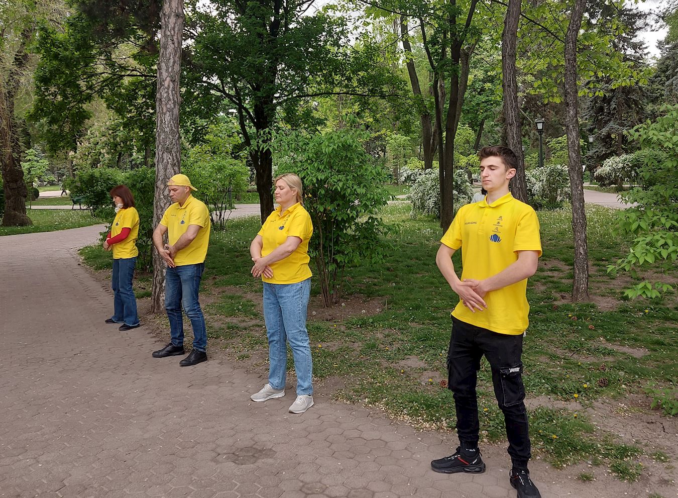 图1:法轮功学员在基希讷乌的斯特凡大公公园炼功,向人们传播法轮功的美好及真相。
